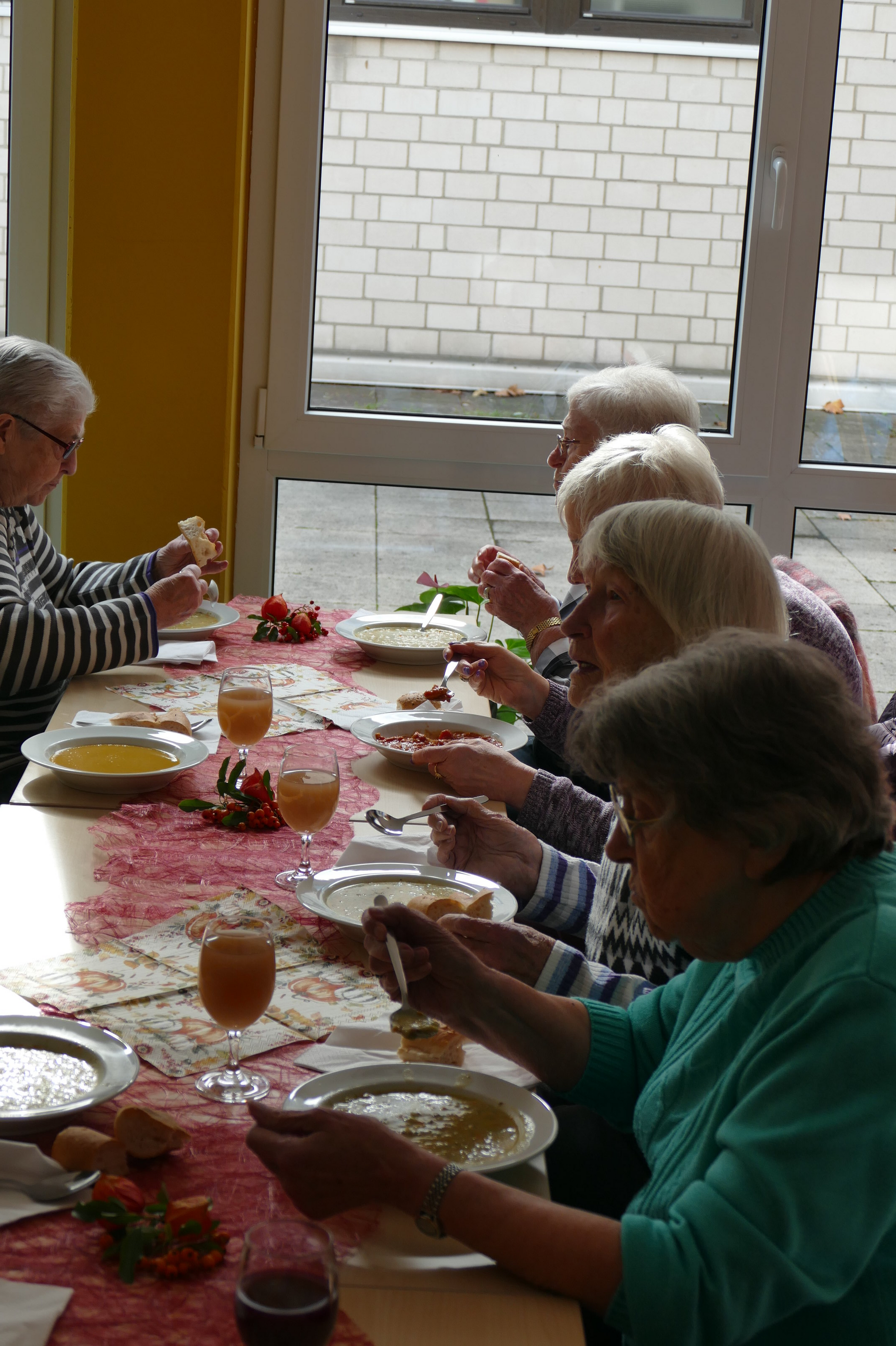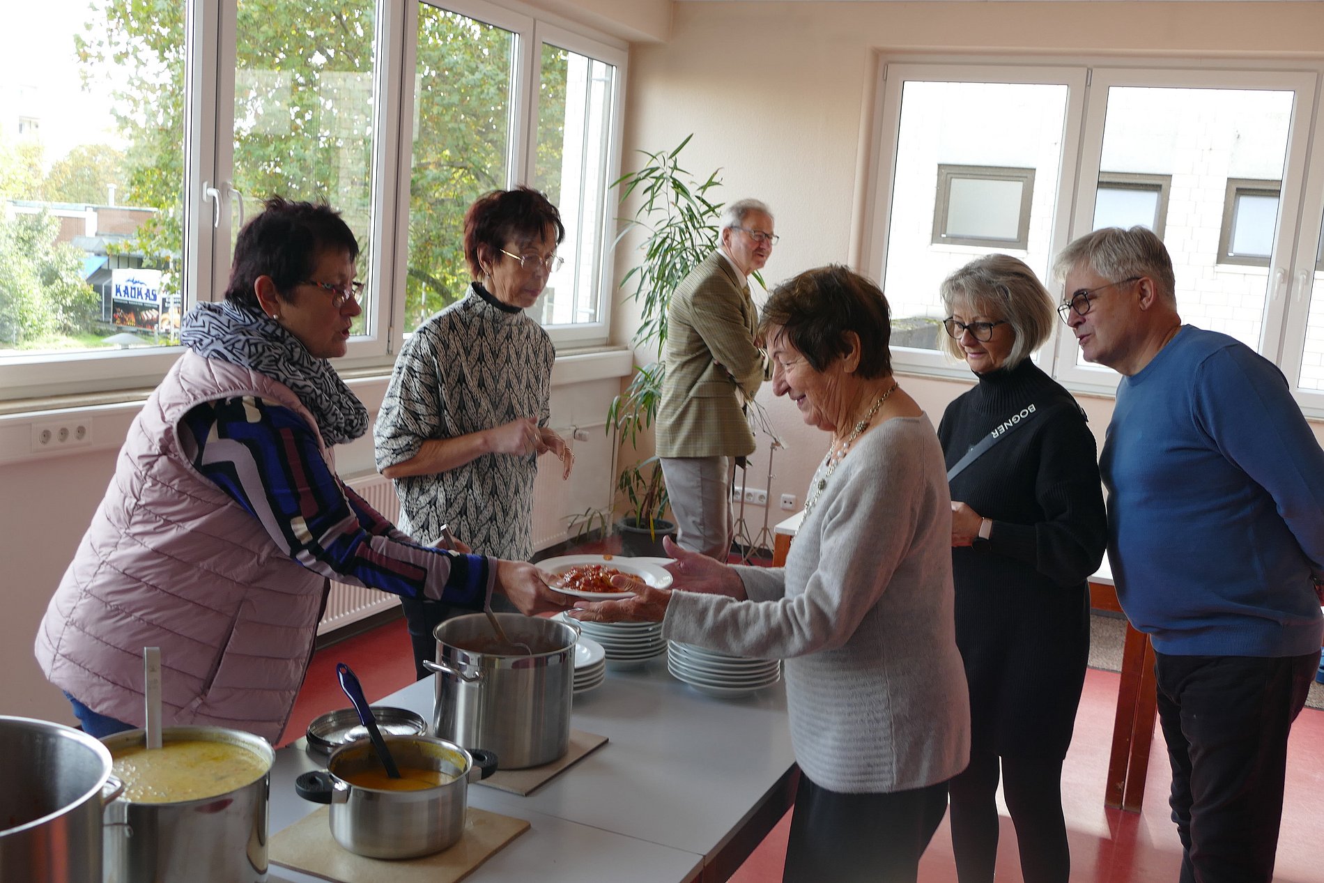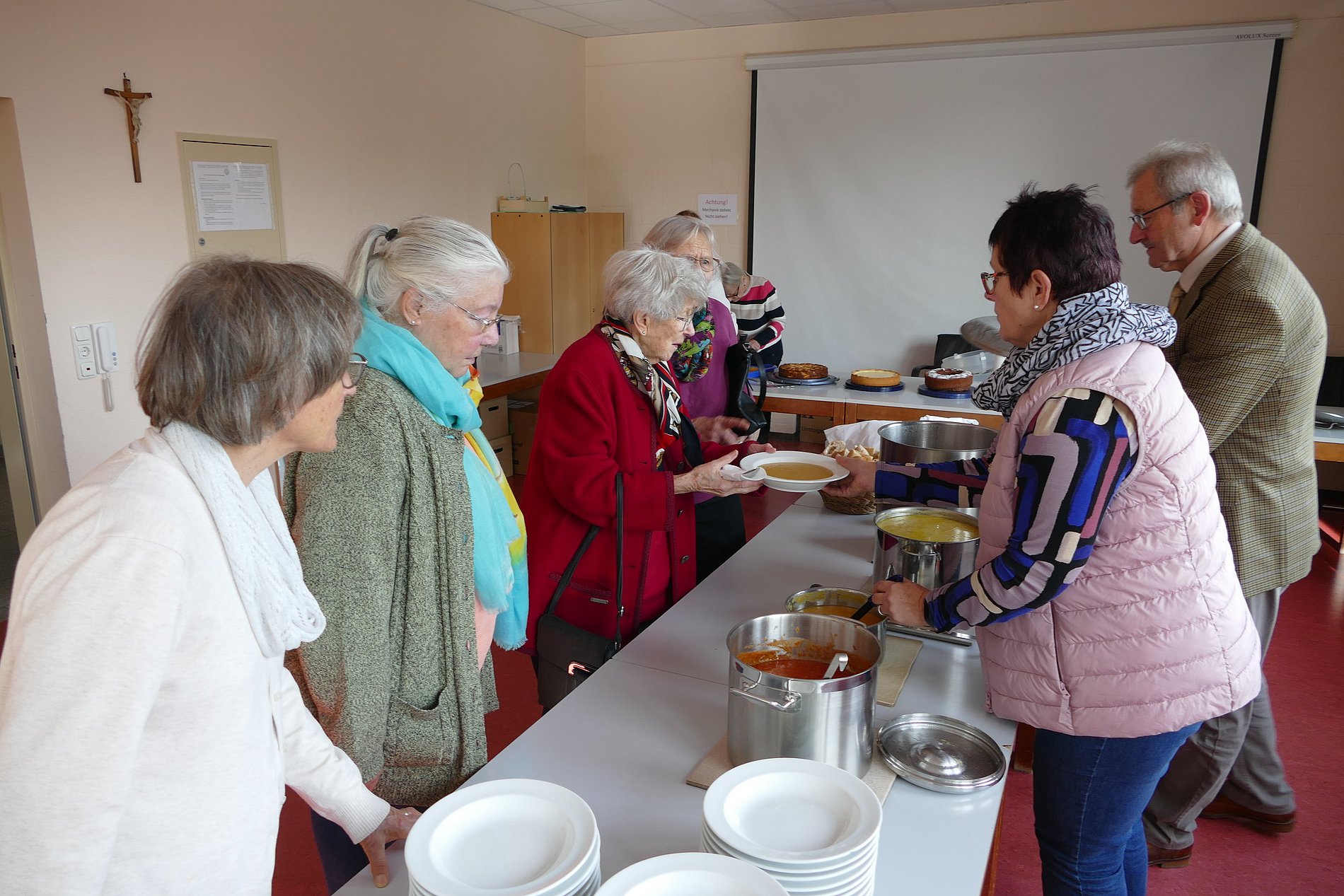 Der Festausschuss von St. Klara hatte vier unterschiedliche Suppen vorbereitet, unsere emsigen Kuchenbäckerinnen sechs leckere Kuchen beigesteuert und Marktbeschicker Johannes Leib vom Wochenmarkt in Kohlheck hatte neun Liter Federweißen gespendet, der die Stimmung der Gemeindemitglieder merklich steigen ließ. So waren es drei beschwingte und kommunikative Stunden, in denen man bei Speis und Trank zusammensaß und die Gemeinschaft innerhalb der Kirchortgemeinde pflegte.