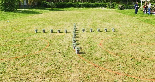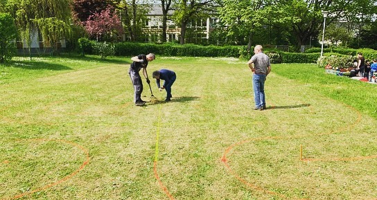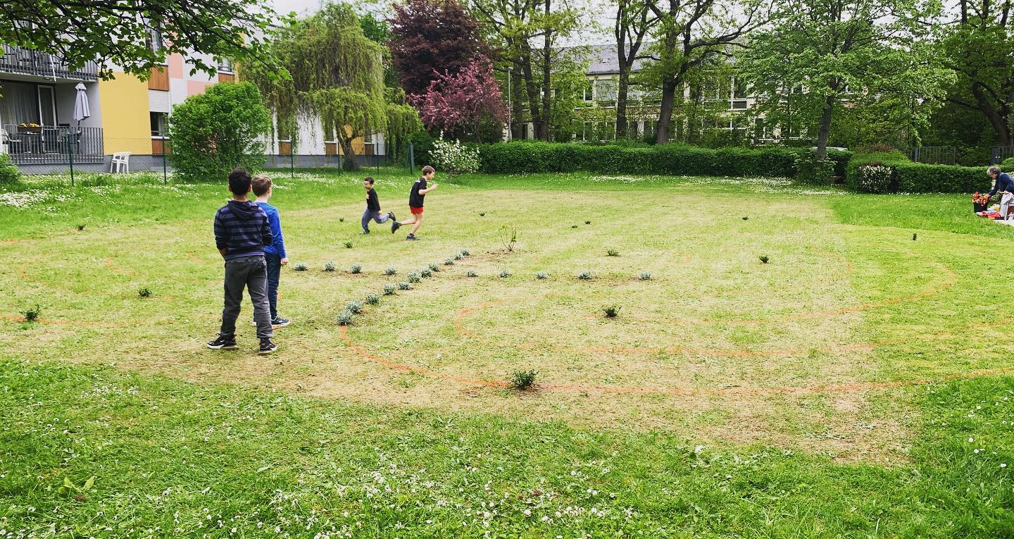 Ganz so einfach wie auf dem Papier war es dann doch nicht: Am vergangenen Sonntag traf sich eine fröhliche kleine Gruppe, um ein großes, begehbares Labyrinth auf die Grünfläche bei der Kirche Mariä Heimsuchung zu pflanzen und zu säen. Als größte Herausforderung stellte sich jedoch nicht die Gartenarbeit heraus, sondern der Versuch, die Form des Labyrinths exakt und mit immer gleichen Gangbreiten auf die Rasenfläche zu übertragen. Mit viel Kopfarbeit, Skizzieren und Ausdiskutieren gelang es schließlich doch – und mit speziellem Spray wurde das Labyrinth auf dem Rasen „vorgezeichnet“. Mit dabei waren eine Handvoll fleißige Helfer, Erwachsene und auch fünf Kinder, die besonders eifrig bei der Sache waren und sichtlich Freude nicht nur am Umgraben und Pflanzen hatten, sondern auch am vorhergehenden Knobeln in Bezug auf die richtigen Winkel und Abstände.