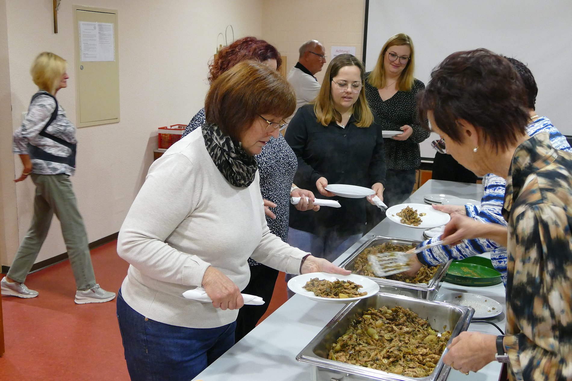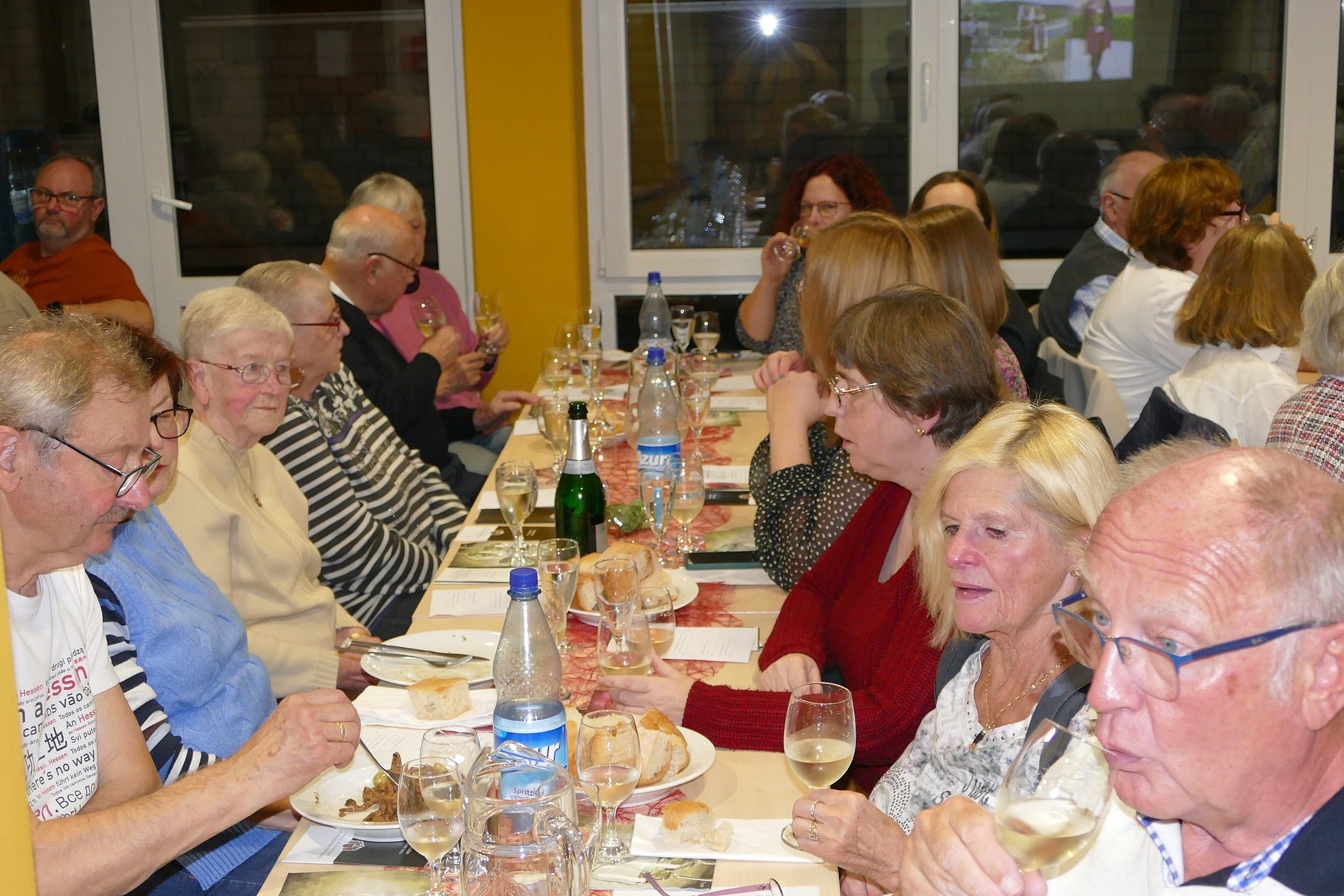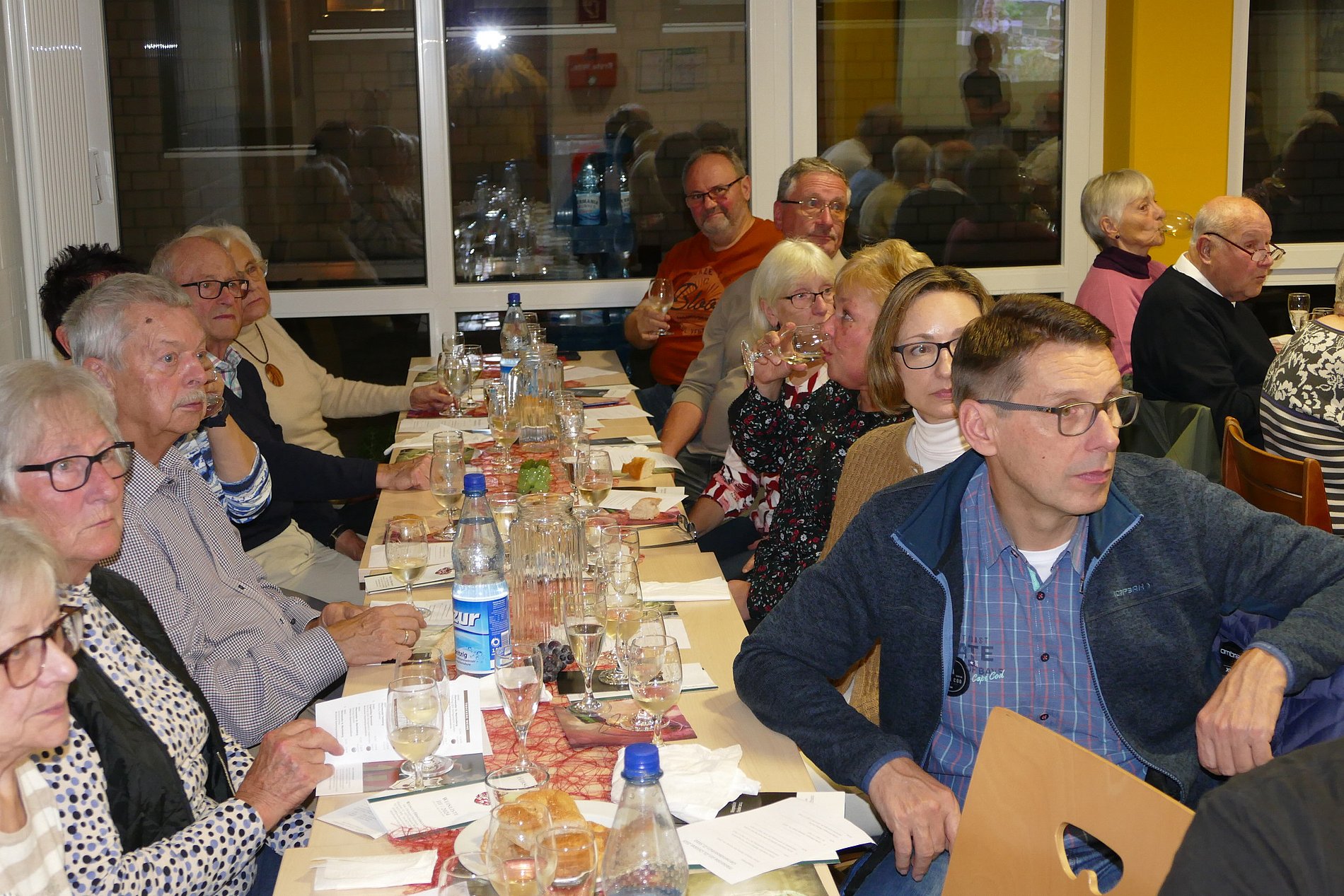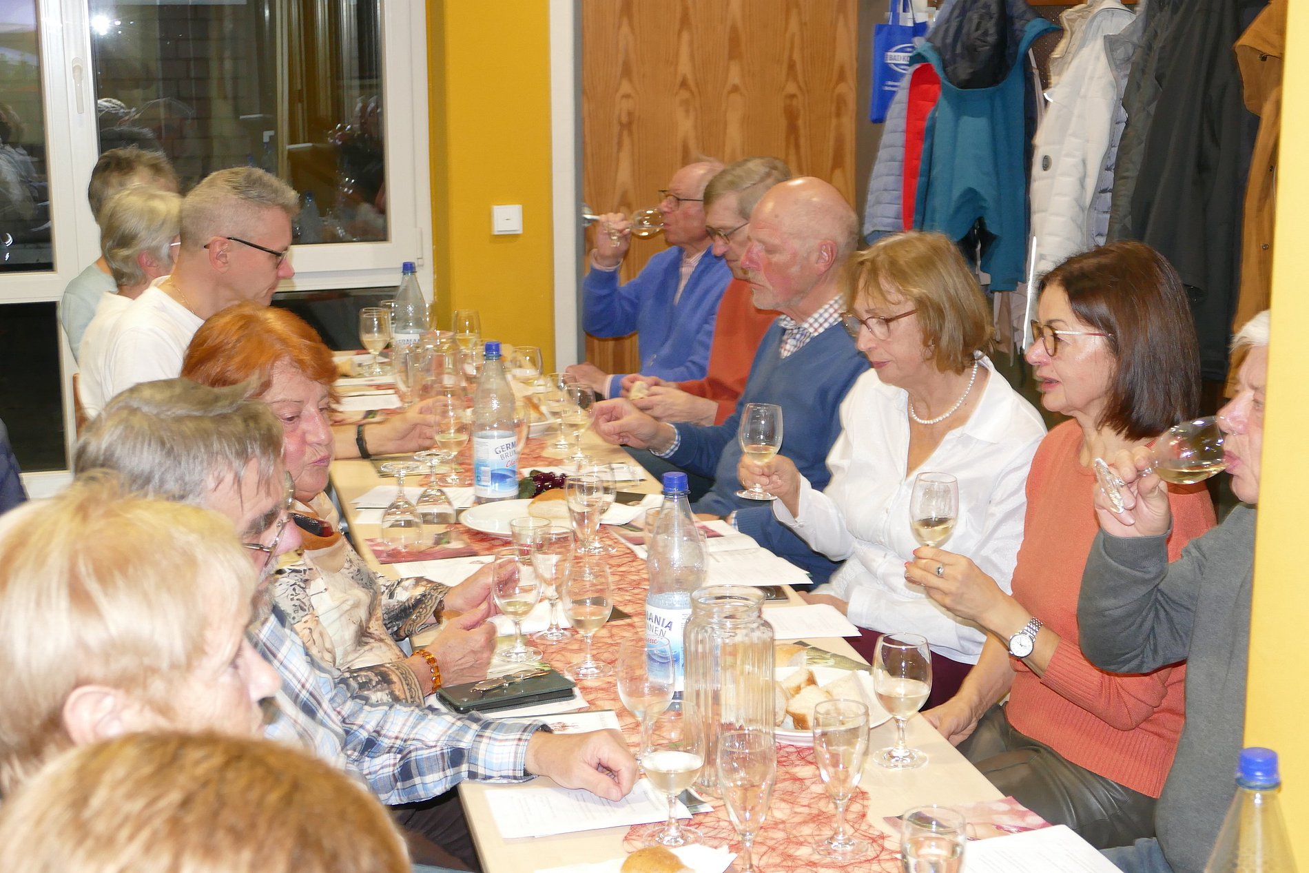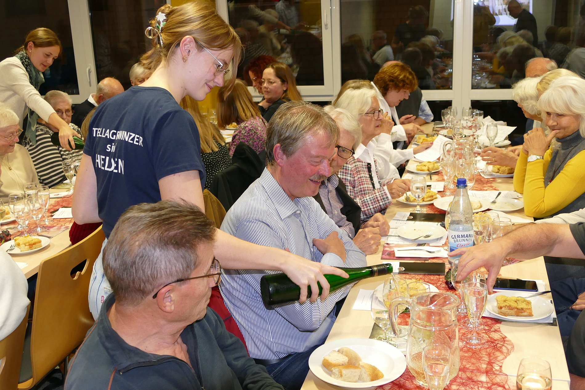 Zu Beginn der Veranstaltung gab es zur Begrüßung ein Glas Winzersekt aus dem Hause Hirschmann und danach als Grundlage eine leckere Winzerpfanne, zubereitet von der „Küchenbrigade“ von St. Klara – den Herren Nowak und Giacca. Da die Küche des Gemeindezentrums nicht mehr benutzt werden darf, wurde auf der Dachterrasse des Zentrums mittels Gasgrill gebrutzelt.