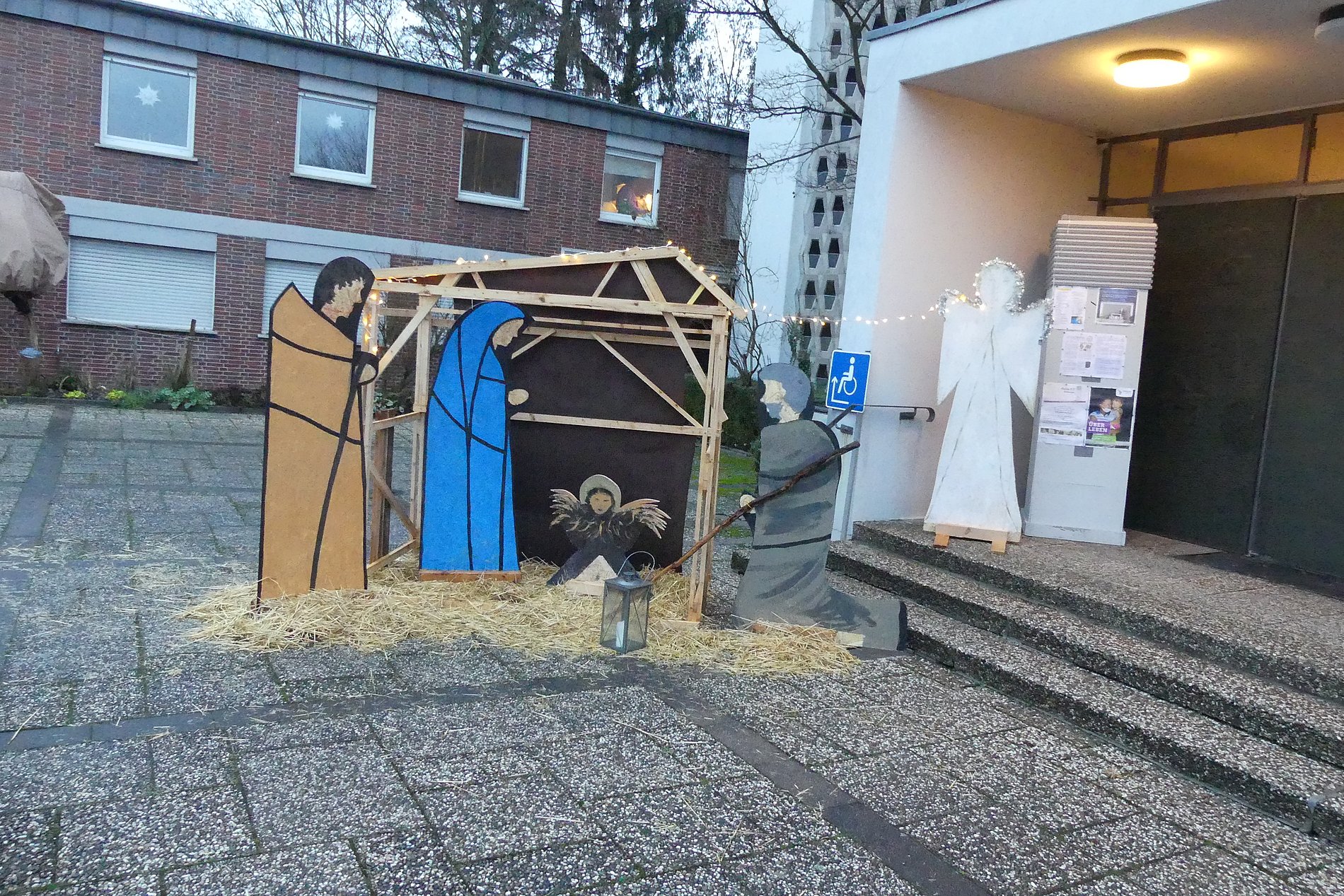(Bild) trafen Maria, Josef und das Jesuskind, die von einem Team aus Haupt- und Ehrenamtlichen begleitet wurden, spontan und ohne Vorankündigung auf viele Menschen. Zwei Bläser sorgten mit weihnachtlicher Musik für die richtige Stimmung, zu der dann das Weihnachtsevangelium erzählt wurde.