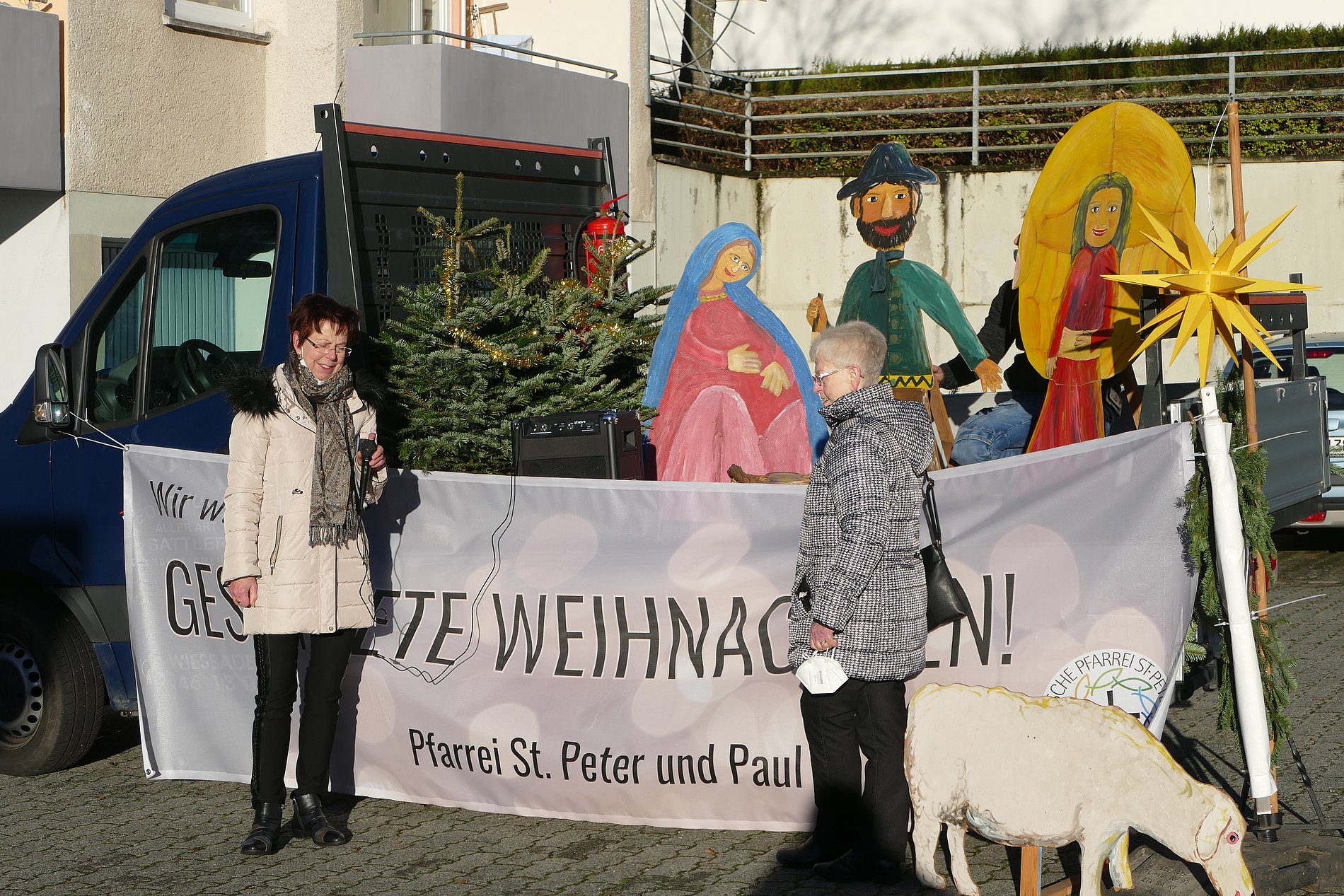 Das „Krippomobil“ hielt auf der Straße oder im Hof vor den Fenstern der Heime. Ein großes Banner mit den Weihnachtsgrüßen der Pfarrei wurde entrollt, dann erklangen bekannte Weihnachtsweisen, dargebracht von zwei Bläsern. Zwischen den einzelnen Stücken wurde das Weihnachtsevangelium vorgelesen und mit einem Segensgebet schlossen die Kurzandachten ab.
