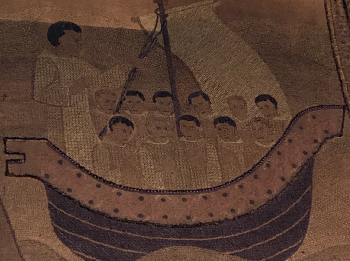 Das Bild zeigt einen Ausschnitt von den drei Wandteppichen in St. Kilian. Kilian auf hoher See mit seinen elf Gefährten. Von Irland macht er sich im 7. Jahrhundert auf den Weg nach Europa. Von seinem Abt ausgesandt, fährt er zunächst nach Frankreich, geht zu Fuß nach Rom, wird dort zum Bischof geweiht und erhält den Auftrag in Germanien segensreich zu wirken.
