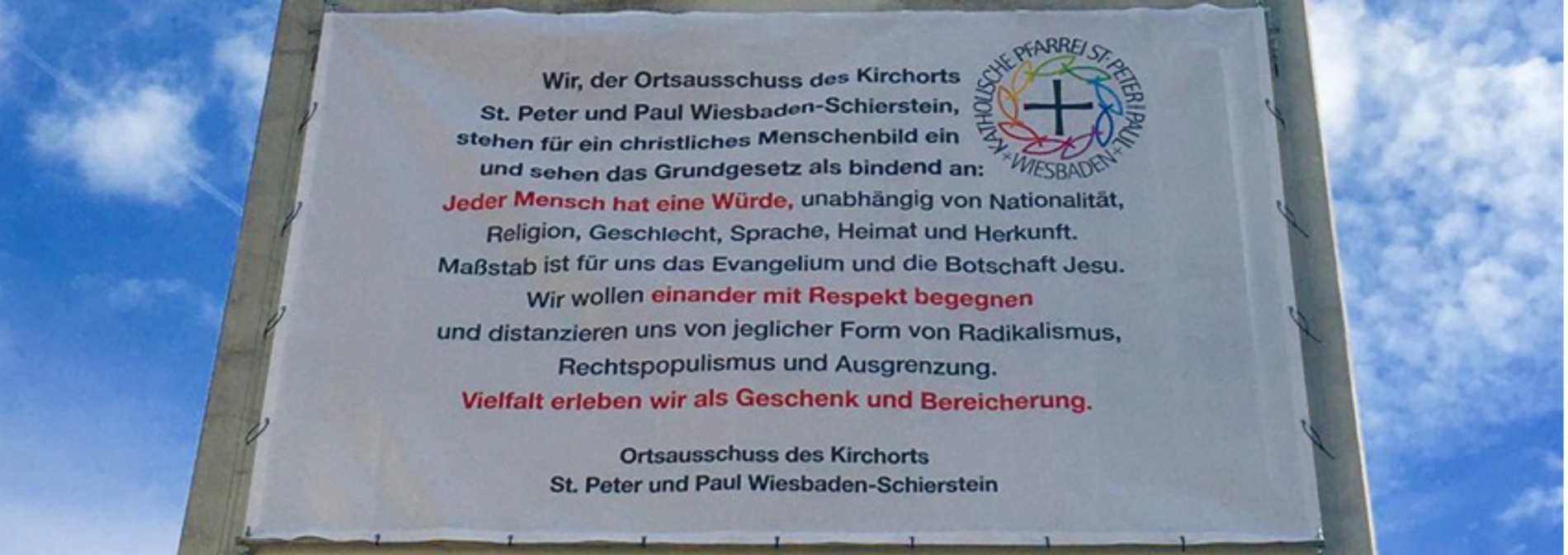 Na, haben Sie dieses Banner schon einmal gesehen? Es hängt bei uns in Schierstein am Turm der Pfarrkirche St. Peter und Paul und das nun schon seit November 2019, weswegen es vielleicht kaum mehr ins Auge fällt. Eigentlich sollten es Selbstverständlichkeiten sein, die hier zu lesen sind, aber es bedeutete einmal Aufbruchsstimmung für unser Team von „Christen sagen ihre Meinung /Maria 2.0“.