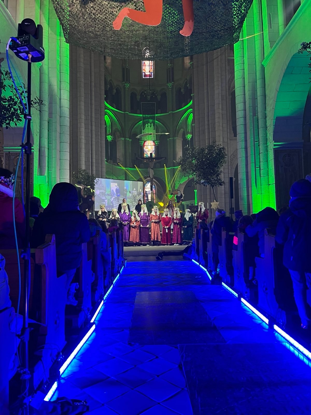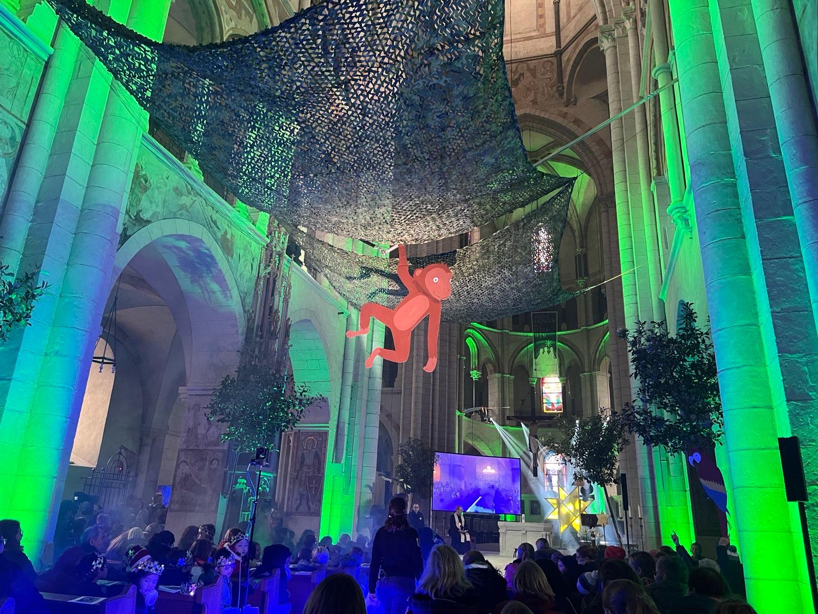 Innen zeigte sich der Dom ziemlich stark verwandelt: Tiergeräusche erklangen, Pflanzen, vereinzelte große Stofftiere und ausgespannte Netze, die ein Blätterdach darstellten, in Verbindung mit ganz viel grünem Licht hatten ihn in einen Urwald verwandelt. Der Mittelgang - blau angeleuchtet, und mit waberndem Nebel als Wasser - war zum Amazonas geworden. Schnell wurde allen klar, was es damit auf sich hatte: Die Spenden, welche wir Sternsinger in 2024 sammeln werden, werden Kindern in der Amazonas-Region zugute kommen.