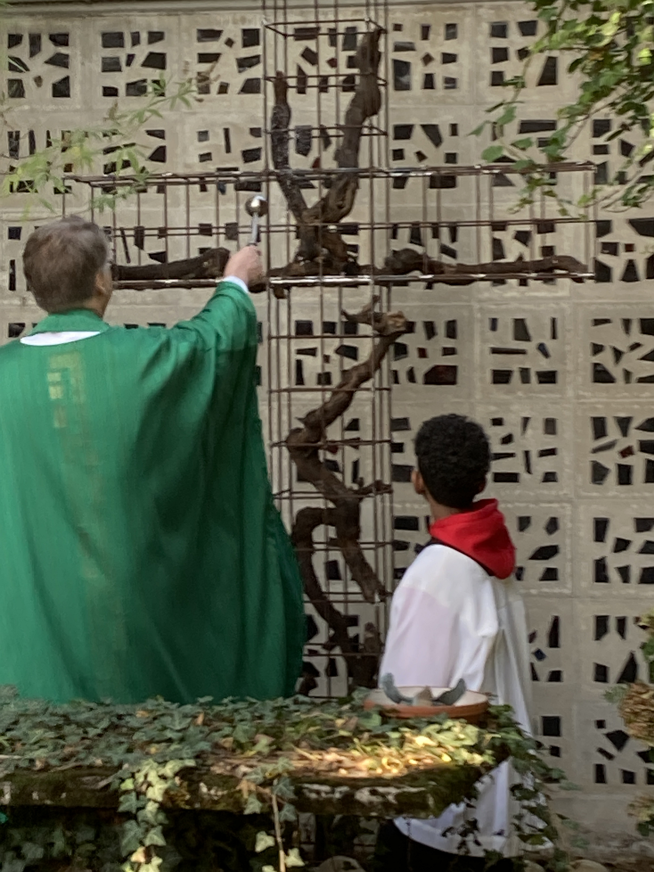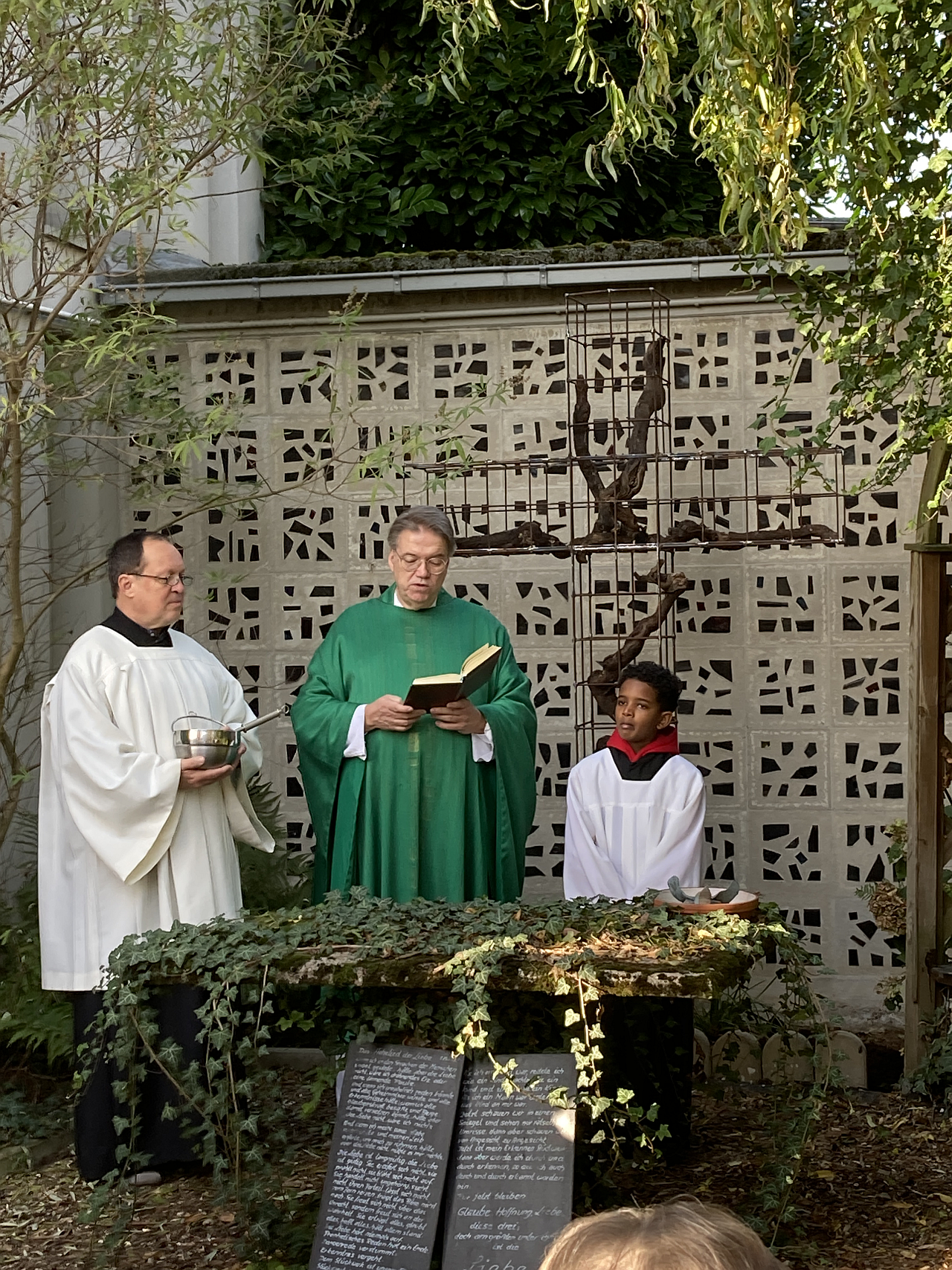 Die drei Bereiche Glaube, Hoffnung, Liebesind im Bibelgarten rund um die Kirche St. Peter und Paul botanisch angelegt. Für den Bereich der Liebe hat der Künstler Romeo Panaite gemeinsam mit einem Kollegen Lajos Benedek ein Kreuz aus Baustahlmatten geschweißt, das am Sonntag, 3. November nach dem Gottesdienst von Pfarrer Schmitt feierlich gesegnet wurde. Elisabeth Kessels, Gabriele Socher-Schulz und das Bibelgarten-Team hatten die Idee zu diesem Kreuz schon lange und nun konnte über Laszlo Hauler, der die beiden Arbeiter aus seiner Firma dankenswerterweise dafür freigestellt hatte, die Umsetzung erfolgen.