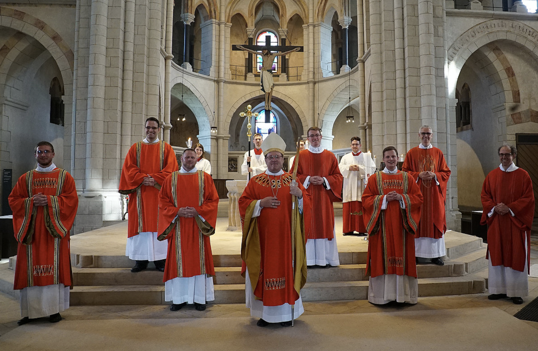 nachdem im letzten LebensZeichen schon ein Bericht über meine Diakonenweihe erschienen ist, möchte ich mich jetzt persönlich an Sie wenden. Seit September 2019 war ich als Pastoralpraktikant in der Pfarrei St. Peter und Paul und wurde nun am Pfingstsonntag zusammen mit vier anderen Priesterkandidaten von unserem Bischof Dr. Georg Bätzing zum Diakon geweiht. Die Weihe war ursprünglich für Ende März geplant, musste aber wegen der Corona-Pandemie abgesagt werden. Ich bin glücklich, dass die Weihe nun unter den bekannten Auflagen auf sehr schöne Weise im Limburger Dom stattfinden konnte.
