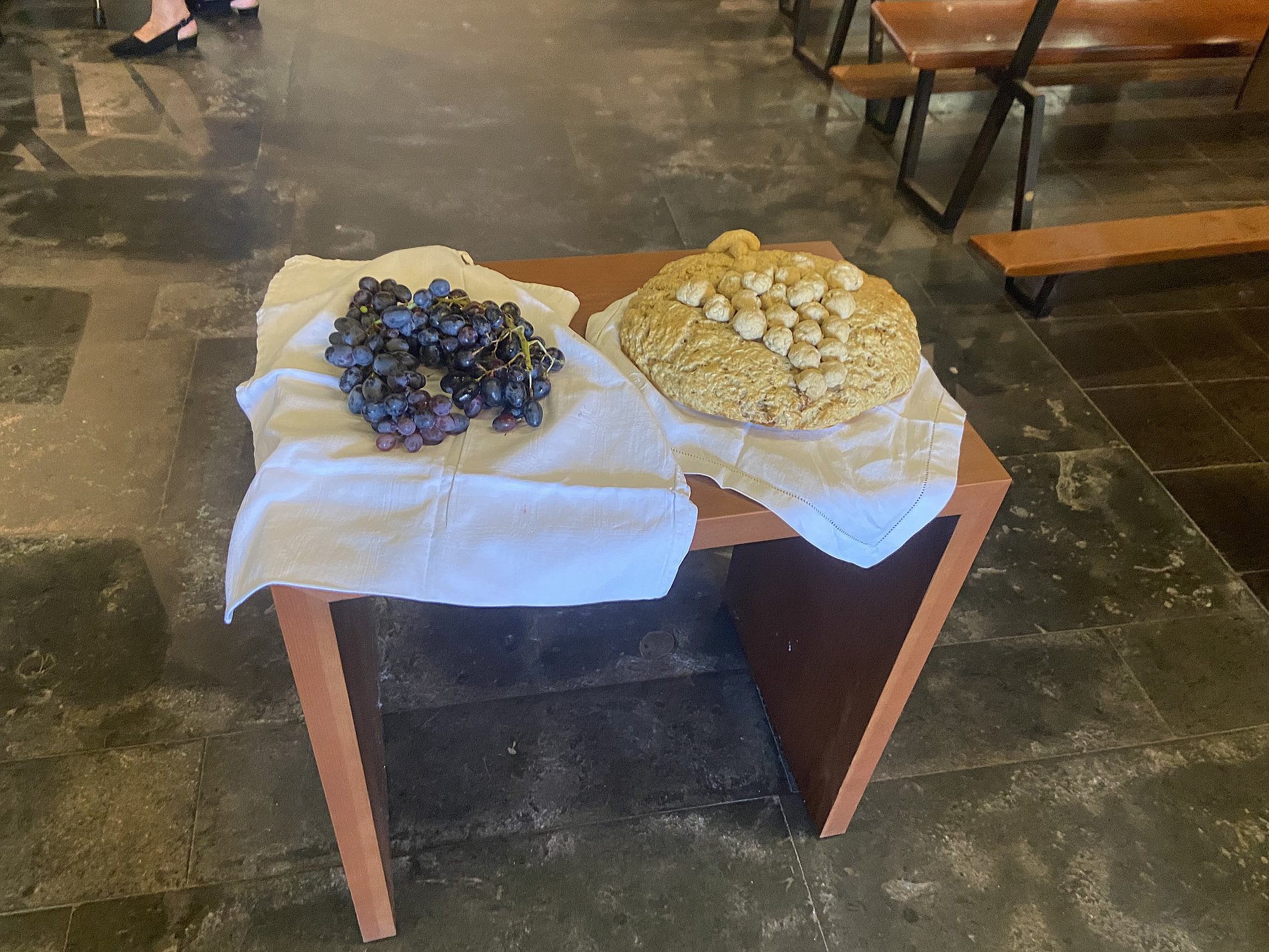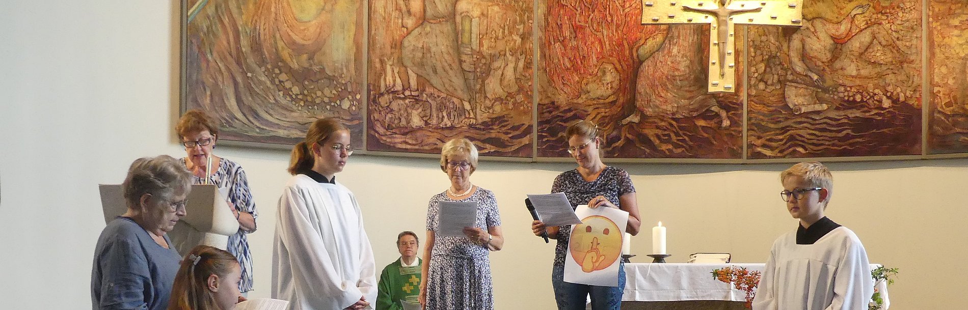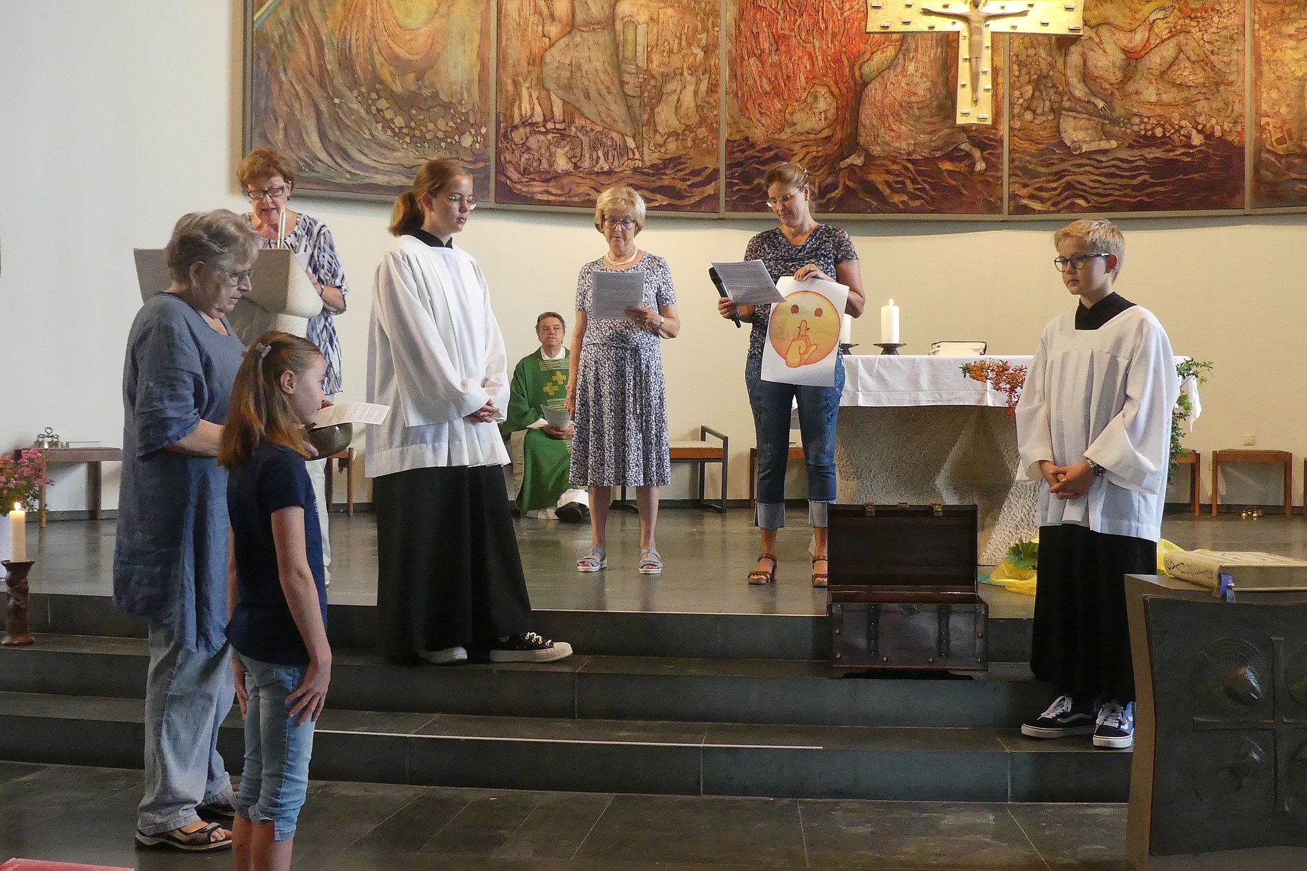 Einen Weinberg gibt es schon lange im Bibelgarten, aber ein Weinlesefest gab es in diesem Jahr zum ersten Mal. Nach einem Familiengottesdienst, in dem es um den „Weinberg des Herrn“ als ein Bild für die Kirche ging und der Frage welche Schätze hat die Kirche die „gehoben“ werden können, ging es auf dem Kirchplatz und dem Weinberg ganz praktisch weiter.