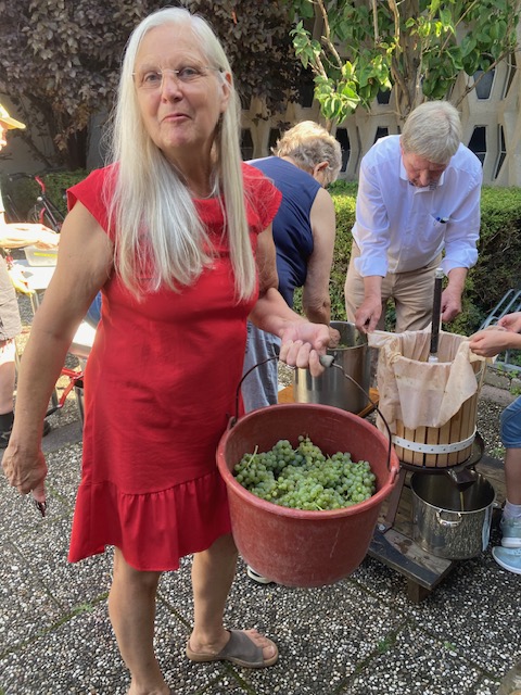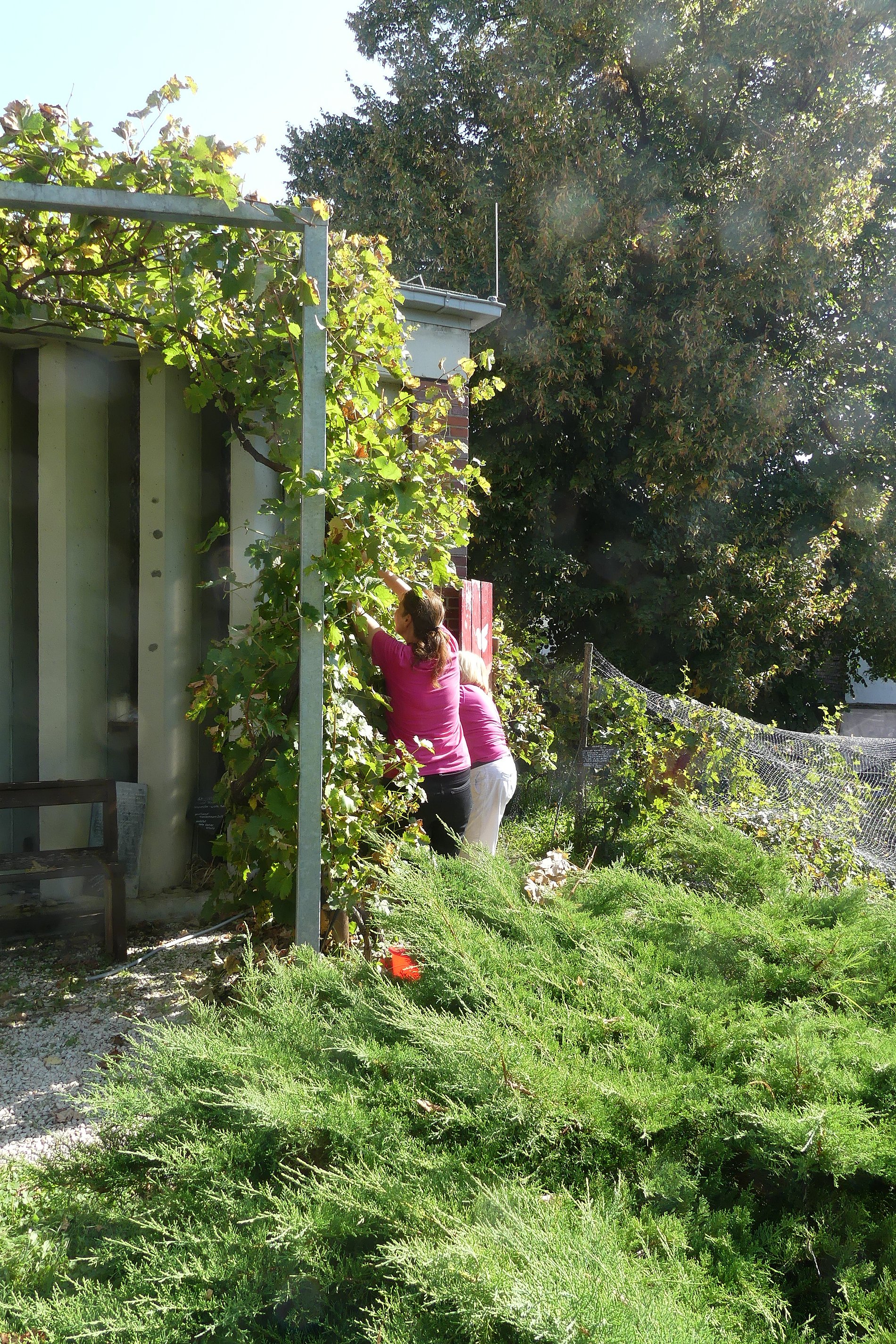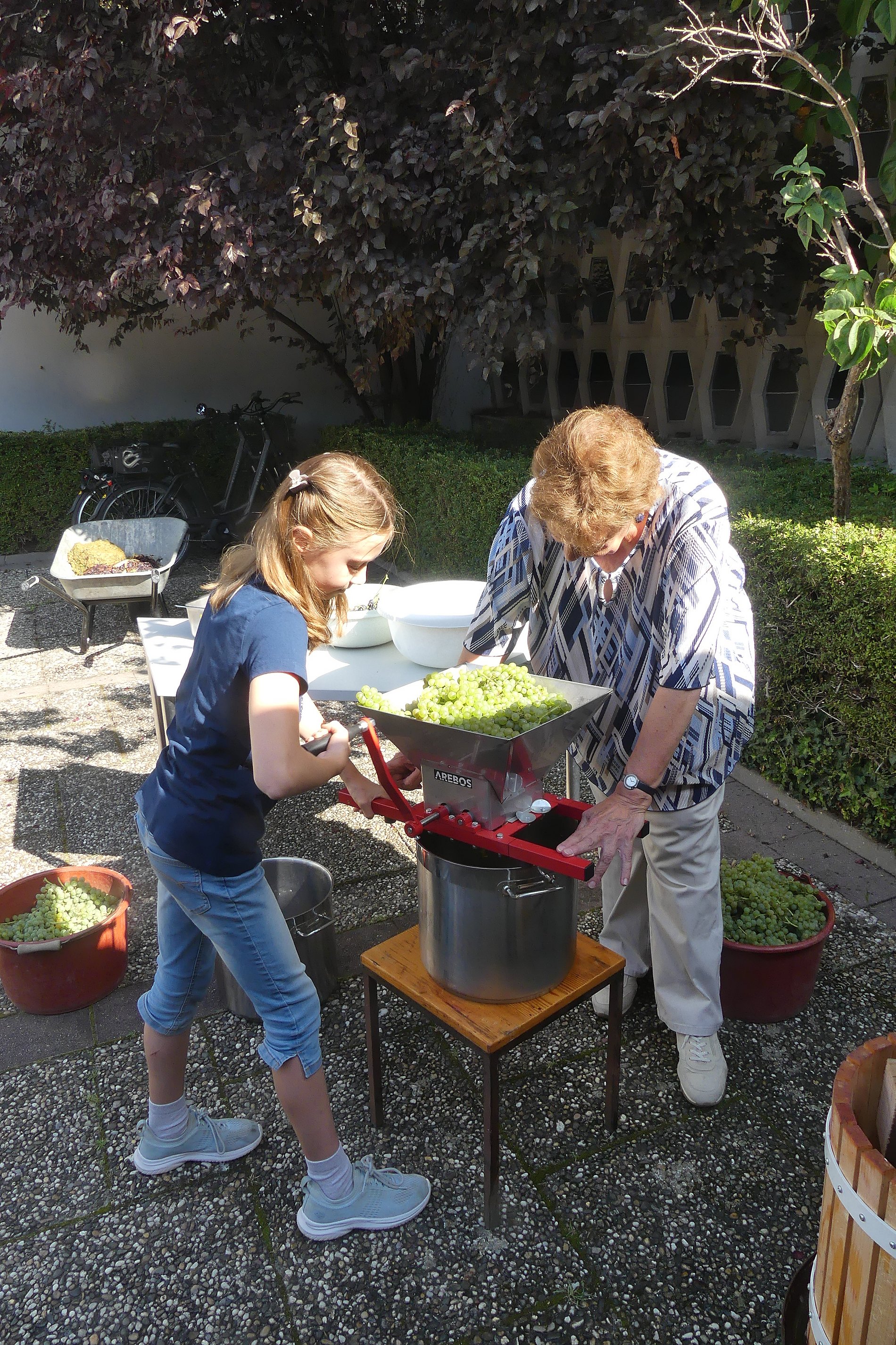 Dann ging es in die Weinlese. Trauben ernten zum Essen und zum Verarbeiten. Fleißige Hände haben geerntet gemahlen und gekeltert.