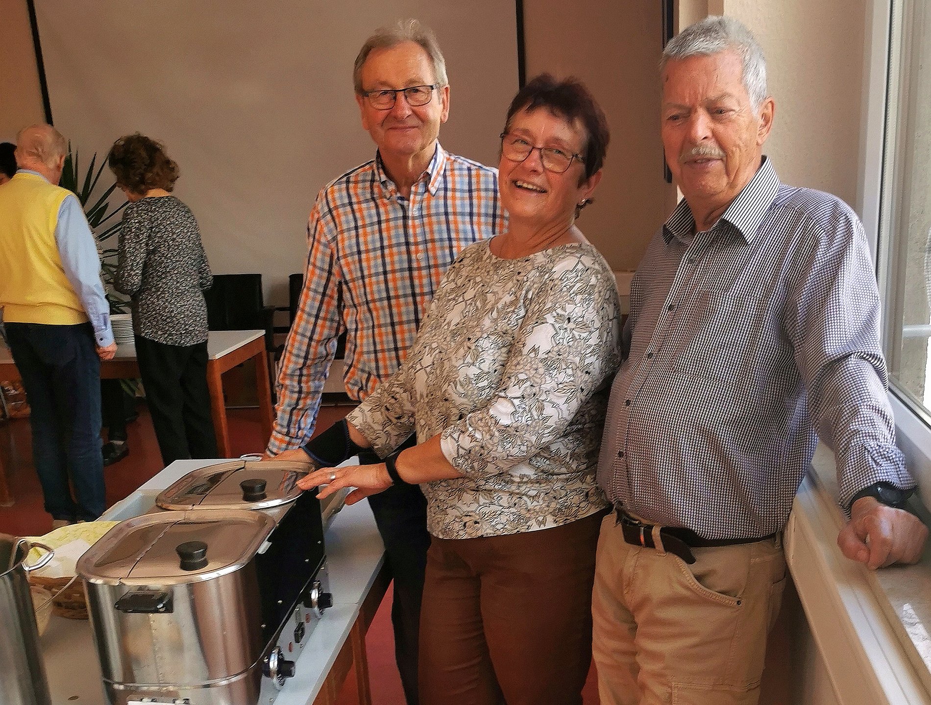 16:50 Uhr: Die drei Helfer bringen die schweren Hockerkocher und die großen Kochtöpfe für die Suppen, den Grill mit der Gasflasche und den Würstchenkocher in Stellung, zwei Helferinnen wickeln Besteck in Servietten, stellen Teller und Tassen bereit, auch die Schüsseln für die Salate. Zwei weitere Helferinnen dekorieren die aufgestellten Tische im Foyer mit bunten Blättern und passenden Servietten herbstlich. Die Getränke sind im Kühlschrank.