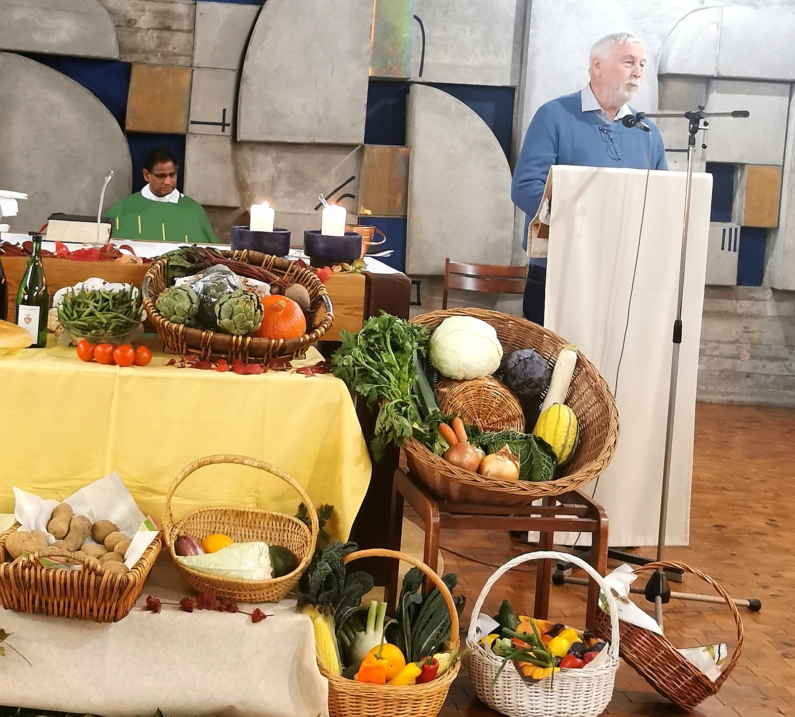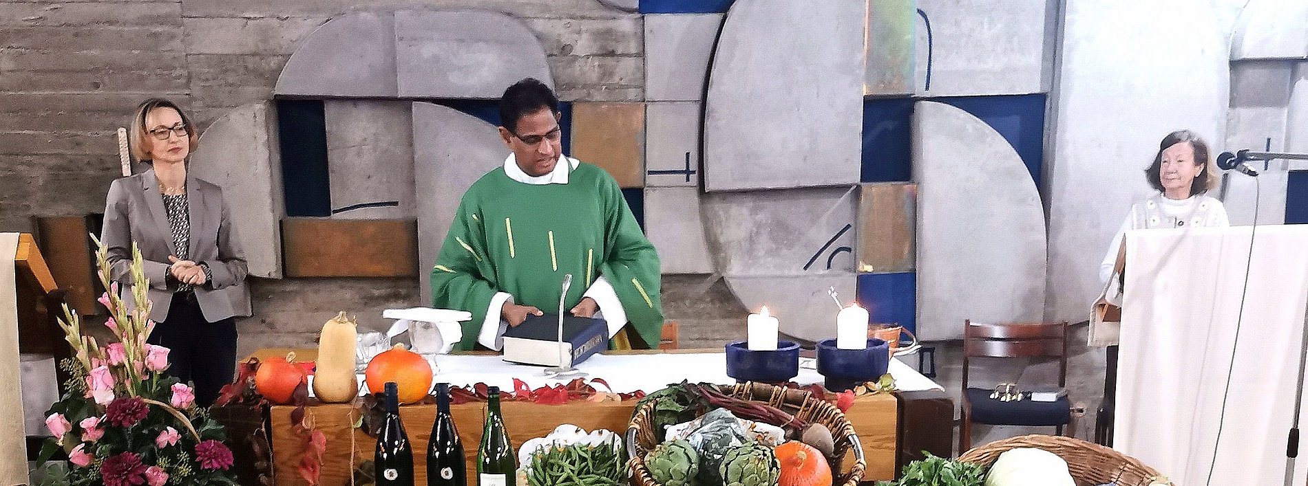 11:00 Uhr: Die Kirche ist voller als zu normalen Sonntagsgottesdiensten. Pater Joy segnet die Gaben auf dem Erntedankaltar mit reichlich Weihwasser – schließlich sollen sie frisch bleiben. Im Evangelium vom Tag geht es um ein Hochzeitsmahl, das ein König ausrichtet und zu dem die eingeladenen Gäste nicht kommen wollen.