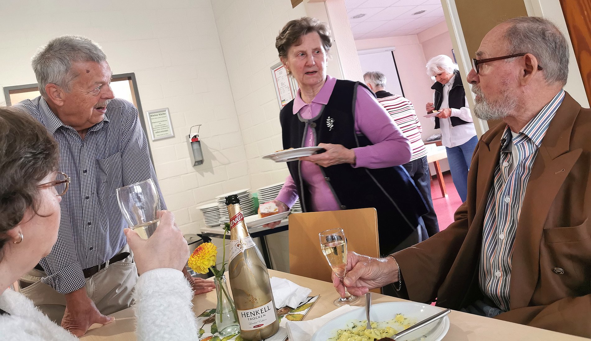 Diese Metapher greift Gemeindeleiter Dr. Rollig bei den Vermeldungen auf und verkündet, dass das Festmahl bereitet sei und wie im Evangelium geschildert alle Gottesdienstbesucher herzlich eingeladen seien. Doch ähnlich wie im Gleichnis nimmt nur rund die Hälfte der Gottesdienstbesucher die Einladung an, die andere Hälfte geht schnellen Schrittes von dannen. Zwar drohen den Davoneilenden nicht die im Gleichnis geschilderten Folgen, doch etwas enttäuscht sind die vorbereitenden Helfer doch. Denn an diesem Tag sind alle Getränke und Speisen frei – man bittet nur um eine großzügige Spende für die Wiesbadener Tafel. Die dagebliebenen Menschen essen und trinken und führen viele gute Gespräche. Und für die Tafel kommen immerhin 323,00 Euro zusammen – ein herzliches „Vergelt´s Gott“ allen Spendern.