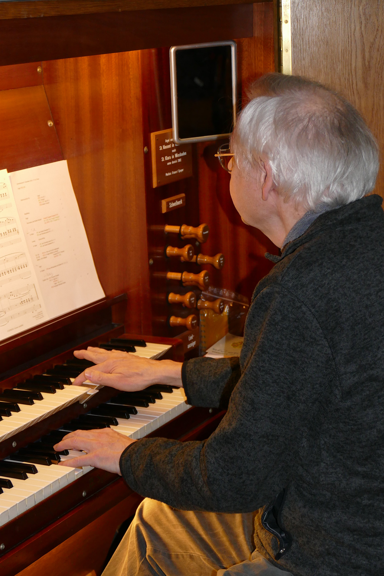Aber jetzt der Reihe nach: Dem Kirchort St. Klara war es wieder gelungen, Frau Petra Mohr zu gewinnen, die mit dem Posaunenchor Brass and More und der Flötengruppe Flute and More das einstündige Programm des Konzerts gestaltete. Burkhard Mohr, der mehrere Stücke der Blechbläser und der Flötengruppe neu arrangiert bzw. komponiert hatte, entlockte der ansonsten etwas biederen Orgel von St. Klara ungeahnte Tonfolgen.