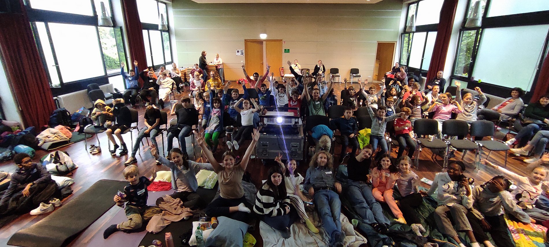 Zum Abschluss des Erstkommunionkurses fand ein weiterer Familientag statt, um gemeinsam mit Erstkommunionkindern, deren Eltern und Geschwistern, den Messdienerinnen und Messdienern und der Familienkirche noch einmal fröhlich zusammenzukommen. Auch wenn der Regen das geplante Open-Air-Kino auf den Schönstattwiesen verhinderte, ließen sich die rund 100 Kinder und Erwachsenen nicht entmutigen und trafen sich kurzerhand und entschlossen im Alfred-Delp-Haus.
