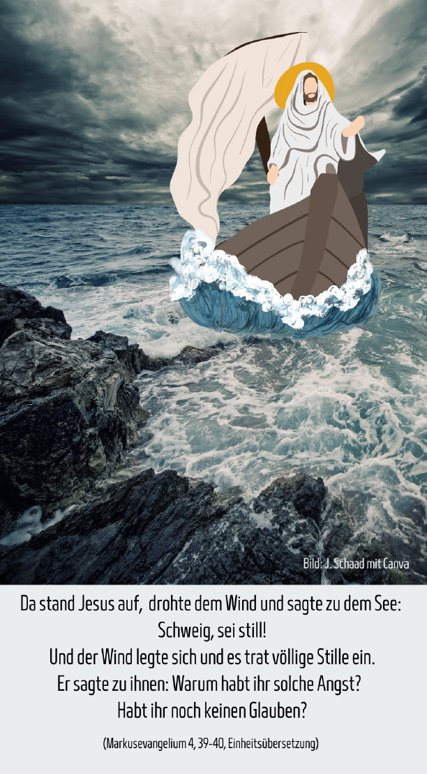 Dass Wetterphänomene Angst machen können, haben wir erst kürzlich wieder in Deutschland und den umliegenden Ländern erlebt, als Sturm und Starkregen für Überflutungen gesorgt haben. Angst macht uns besonders, wenn wir erleben, dass wir die Kontrolle verlieren und den Mächten der Natur ausgeliefert sind. Im Evangelium dieses Sonntags hören wir davon, dass die Jünger Jesu in große Angst geraten, weil ihr Boot in einen Sturm gerät, und Wasser droht es zu versenken. Auch in unse- rem Leben gibt es immer wieder Stürme und Situatio- nen, in denen wir uns bedroht und hilflos fühlen. Das können Zeiten sein, in denen Krankheit, Arbeitslosigkeit, Armut, Streit oder der Tod nahestehender Menschen uns die Endlichkeit und Zerbrechlichkeit unseres Lebens deutlich machen. Dann ist es gut, wenn wir uns an Momente in unserem Leben erinnern, wo sich die Dinge unerwartet gut gefügt haben, wo wir gespürt haben, dass wir nicht alleine sind, und dass nach jeder Nacht ein neuer Tag beginnt: Momente, wo wir sagen können, dass Jesus mit uns im Boot gesessen hat und wir in Gottes Händen gut aufgehoben waren. Auch in unserer Kirche erleben wir gerade stürmische Zeiten. Wir erleben, dass wir uns haltlos fühlen und nicht wissen, wohin der Wind uns trägt. Da ist es gut sich daran zu erinnern, dass wir in der Nachfolge Jesu uns immer darauf verlassen können, dass er uns nahe ist. Und es ist gut, wenn wir neugierig bleiben, auf das unbekannte Land, an das der Sturm uns weht.