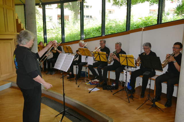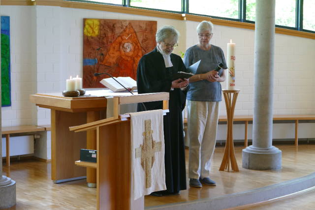 Bei bestem Wetter – Sonnenschein und nicht zu heiß – strömten dann viele Opas, Omas, Söhne, Töchter, Papas und Mamas ins evangelische Gemeindezentrum. Der Kirchenraum war fast bis auf den letzten Platz gefüllt. Alle, die gekommen waren, erlebten einen wunderschönen, lebendigen Gottesdienst, gemeinsam gestaltet von den Liturgie-Teams der Paul-Gerhard Gemeinde, der evangelischen Gemeinde Klarenthal und der katholischen Kirchortgemeinde St. Klara. Musikalisch wurde der Gottesdienst umrahmt vom Posaunenchor „Brass & More“ unter der Leitung von Petra Mohr und Dr. Kiefer an der Orgel.