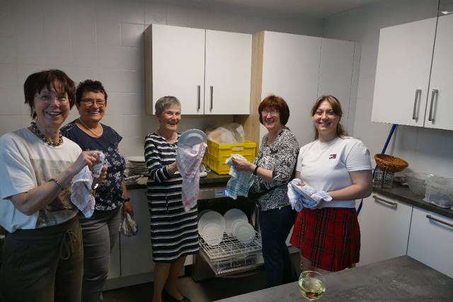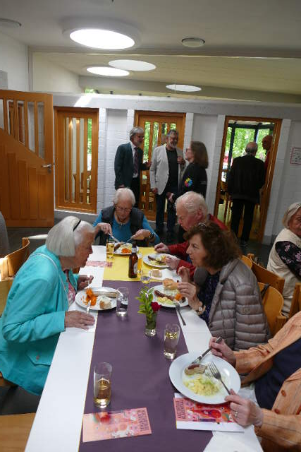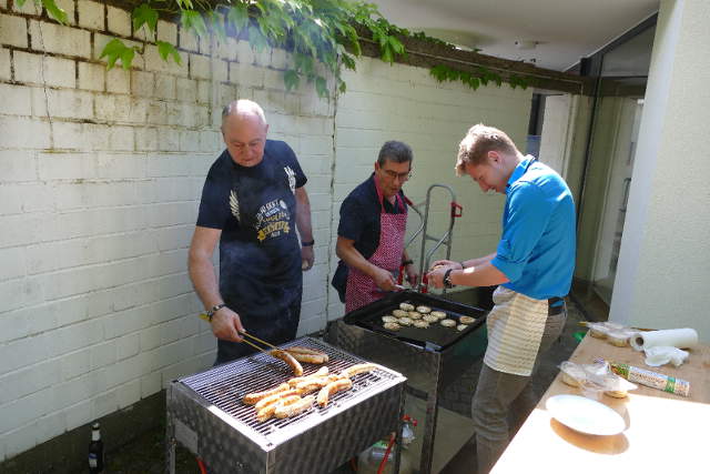 Nach dem Gottesdienst stand schon das Mittagessen bereit: Bratwürste oder Grillkäse, dazu verschiedene Salate und frisches Fladenbrot, die von St. Klara vorbereitet waren. Die evangelische Gemeinde versorgte die Gäste mit kühlen Getränken.