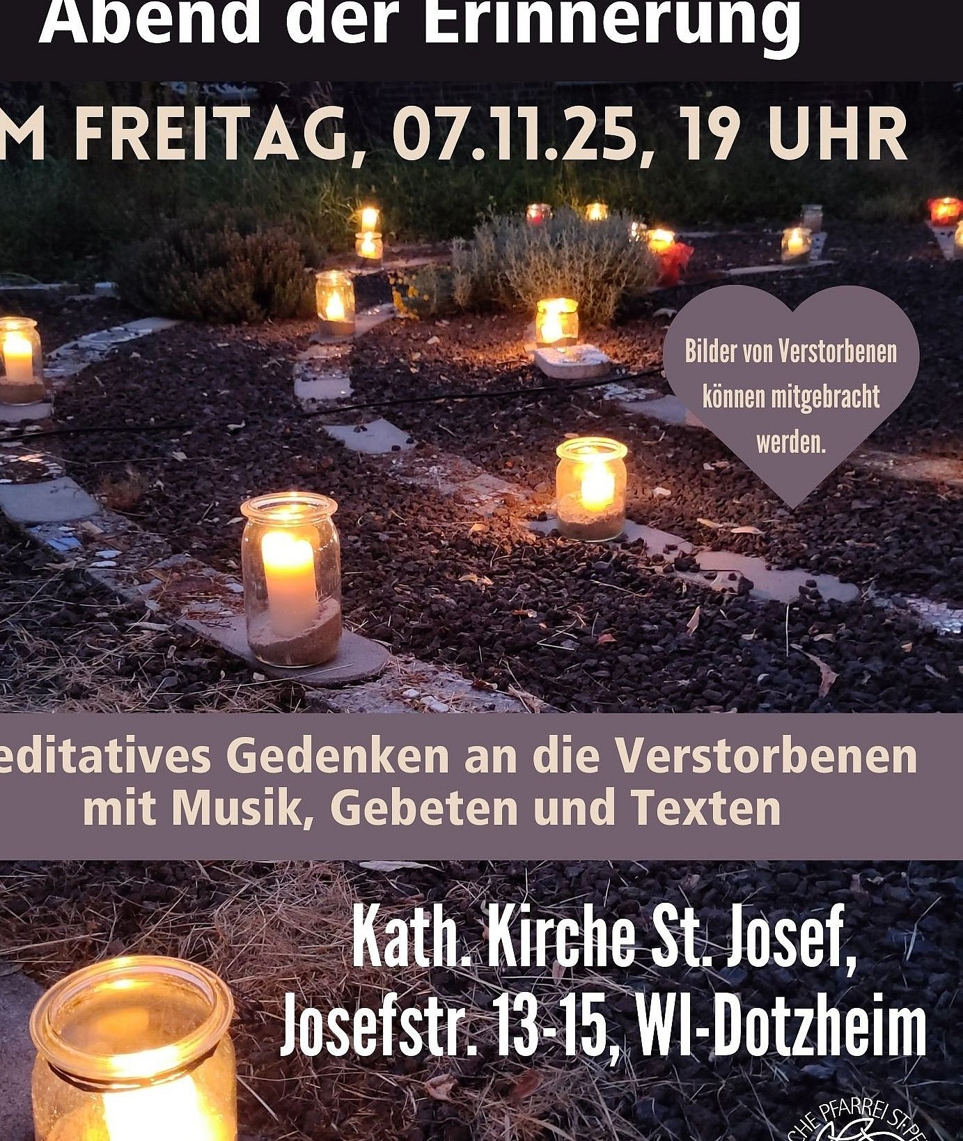 Freitag, 07. November 25, 19 Uhr in St. Joseph Meditatives Gedenken an die Verstorbenen mit Musik, Gebeten und Texten Bilder von Verstorbenen können mitgebracht werden.