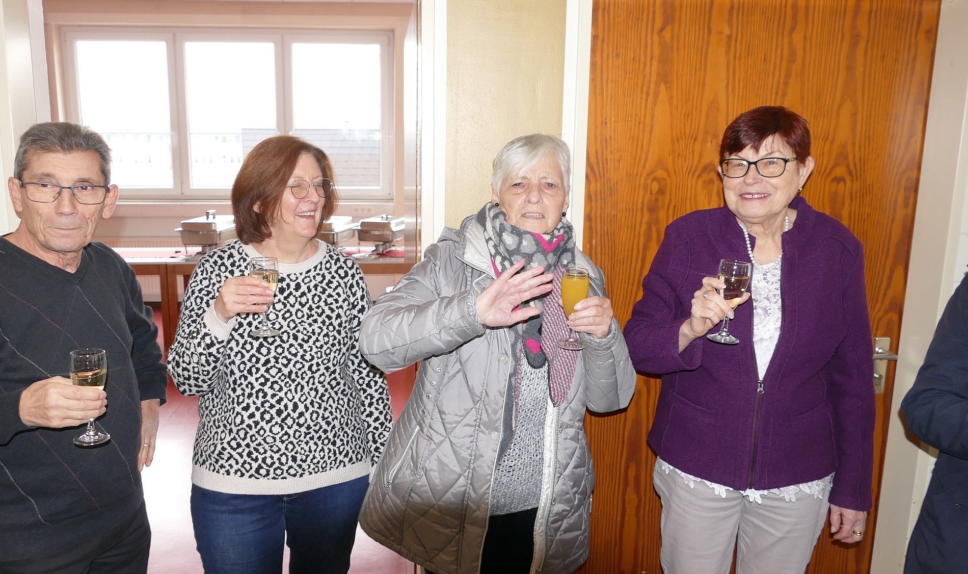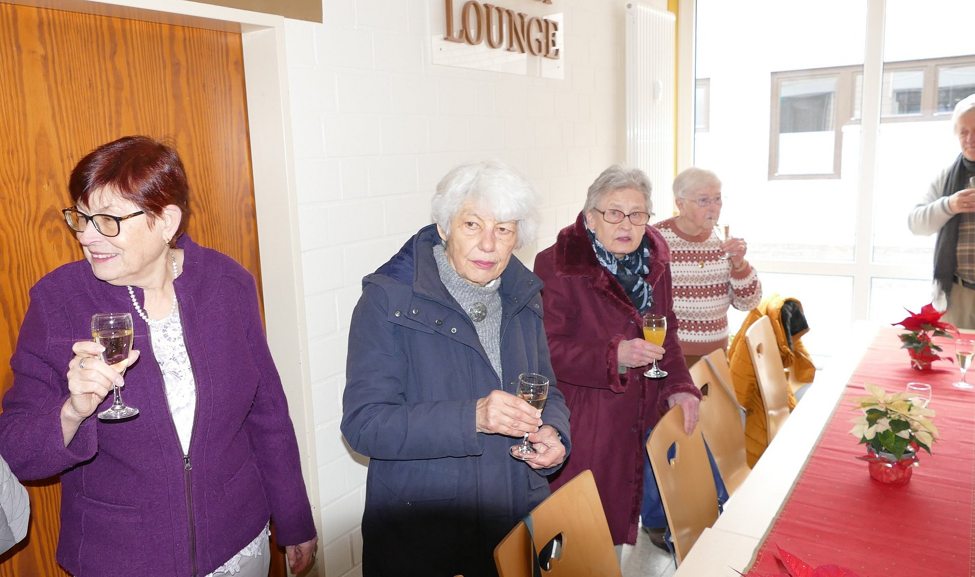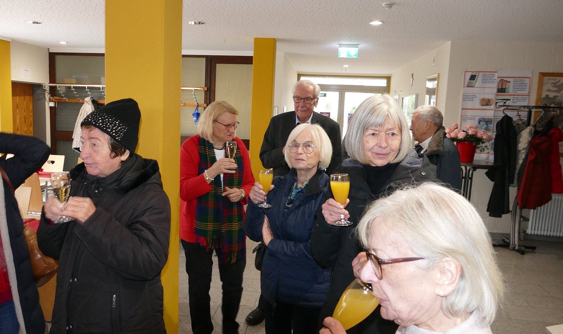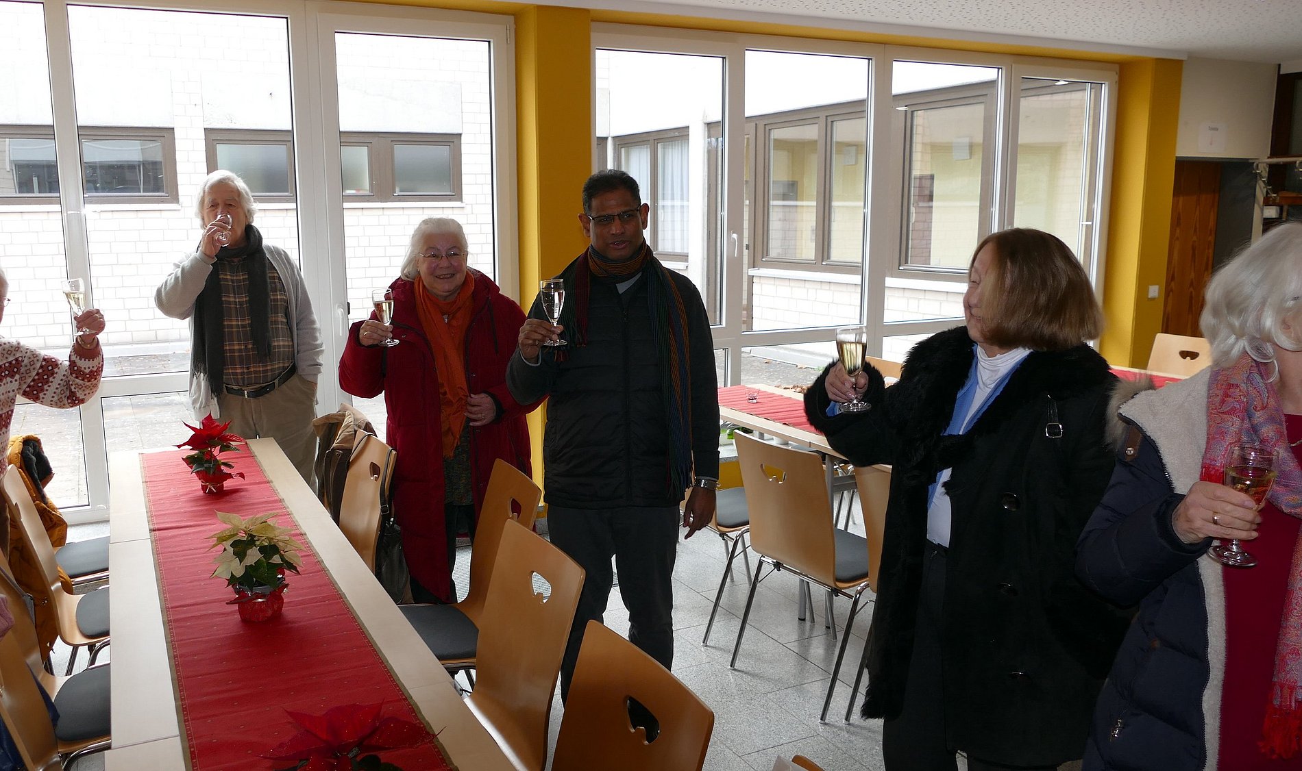 Ein Gläschen Sekt – oder auch zwei – im Stehen nach dem Gottesdienst, dann saßen die Ehrenamtlichen bei einem gemeinsamen Mittagessen und bei Kaffee und Kuchen im kuschelig warmen Foyer zusammen und pflegten die Gemeinschaft. Auf diese kommen im bevorstehenden Jahr mit dem erwarteten Umzug in das neue ökumenische Gemeindezentrum sicher noch einige Belastungsproben zu. Den ehrenamtlichen Damen und Herren tat es gut, an diesem Tag besonders wertgeschätzt und kulinarisch verwöhnt zu werden. Ganz besonders gefreut hat es die Ehrenamtlichen, dass Pater Joy nach dem Gottesdienst nicht gleich wegfuhr, sondern zum Sektempfang (leider musste er noch Auto fahren und begnügte sich mit Mineralwasser) blieb und mit ihnen gemeinsam zu Mittag aß – viele Gespräche mit den Ehrenamtlichen inklusive.