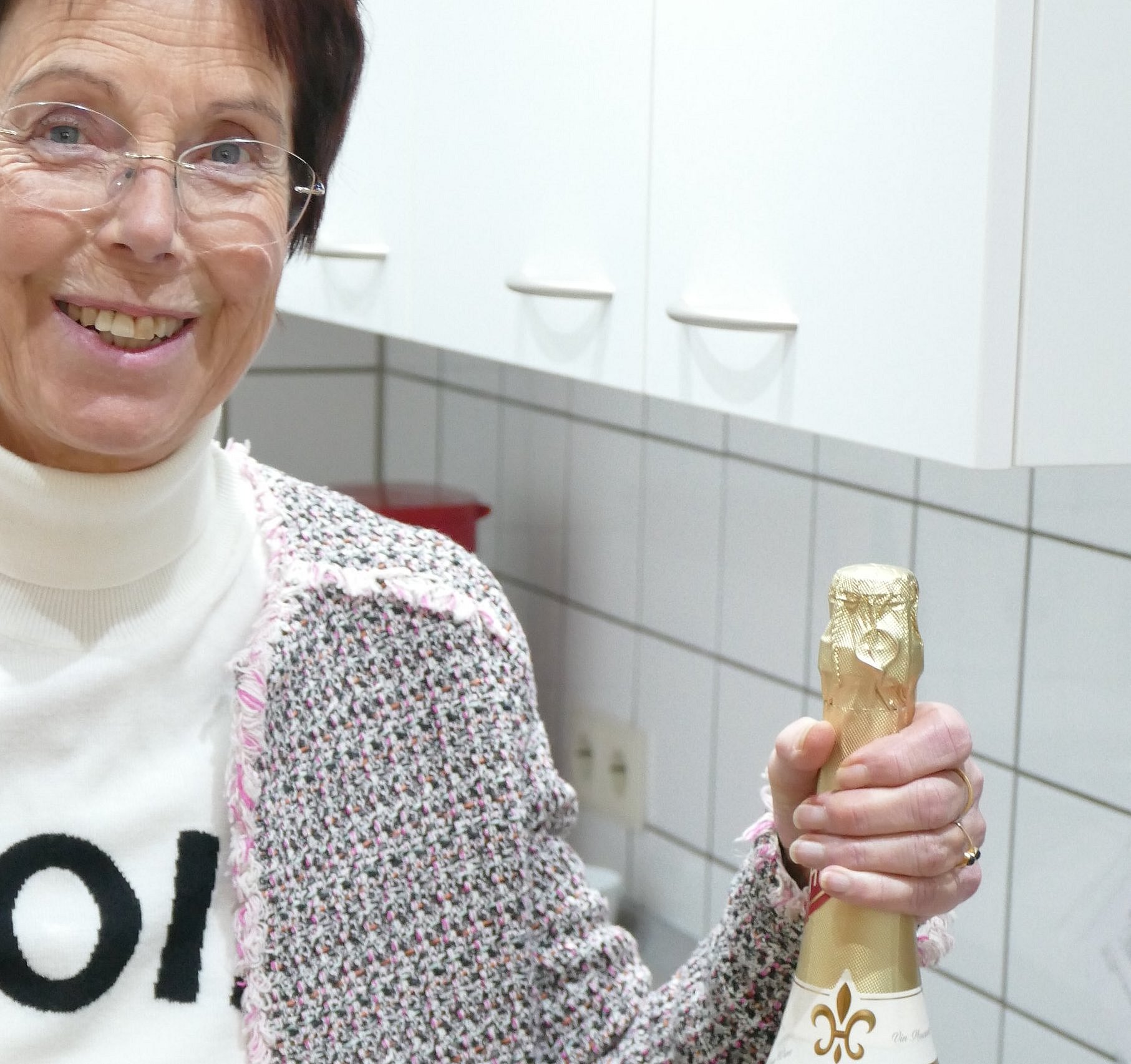30 Jahre hat sie erfolgreich mitgeraten am Sommerrätsel des Wiesbadener Kuriers – und nie etwas gewonnen. Bis auf dieses Jahr. Christa Rollig, die schon lange Jahre in den unterschiedlichsten Funktionen ehrenamtlich am Kirchort St. Klara tätig ist, konnte es anfangs gar nicht glauben. Und dann bekam sie bei der Preisübergabe auf Henkells-Feld eine Doppel-Magnum Flasche Henkell-Sekt nicht in die Hand gedrückt, sondern in die Arme gelegt, denn so eine Riesenflache wiegt ca. 7 kg. Was macht nun ein Zweipersonenhaushalt mit so einer Menge Sekt? Familienfest! Doch ein solches steht in absehbarer Zeit nicht an. Was nun? Die stiften wir zum Tag der Ehrenamtlichen – und schon war der Sektempfang gesichert.