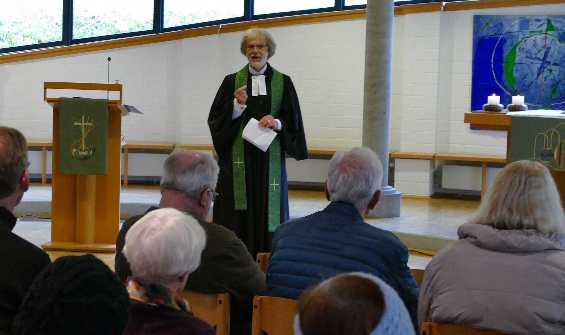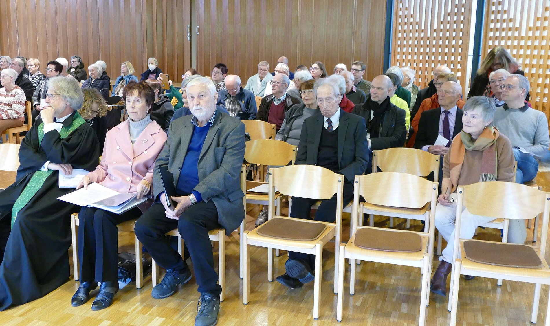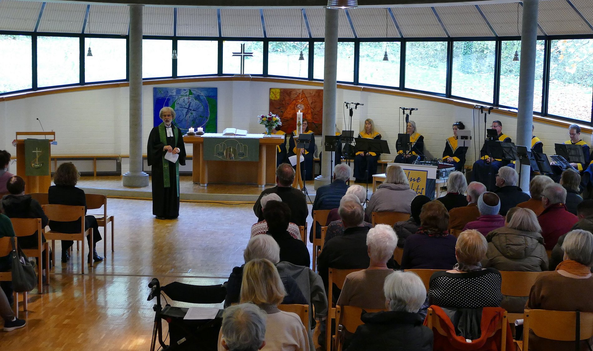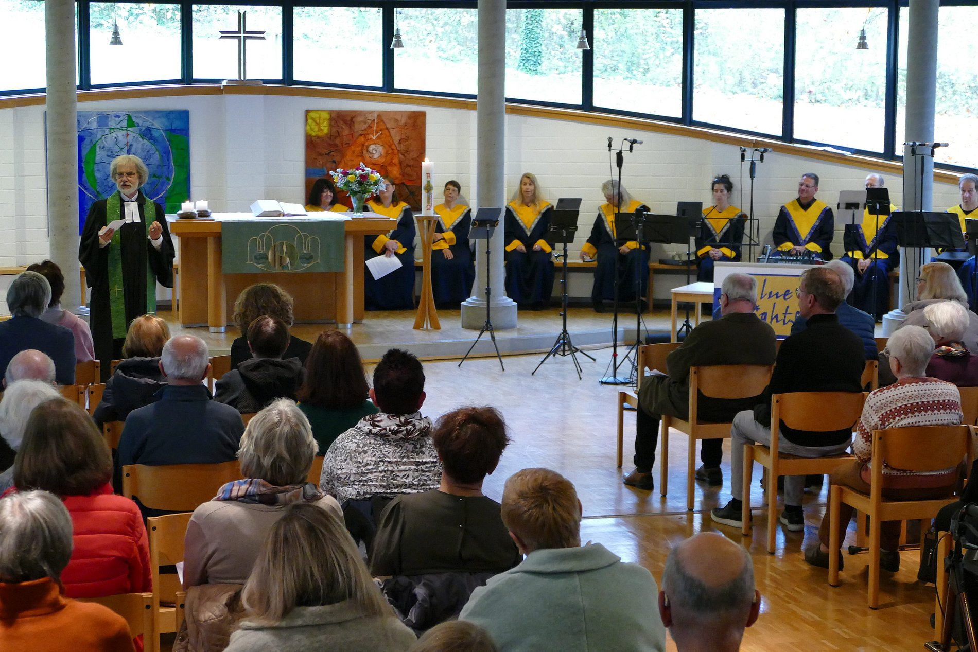 Hell war es am Sonntagvormittag um 10 Uhr schon, besonders, da es nach der Zeitumstellung der letzten Nacht gefühlt schon 11 Uhr sein musste. Und aus einem Himmel mit vielen schnell ziehenden Wolken wagten sich einige Sonnenstrahlen hervor und leuchteten in den Gottesdienstraum des evangelischen Gemeindezentrums. Fast einhundert Besucherinnen und Besucher aus beiden Gemeinden, aber auch Gäste von außerhalb, hatten den Weg an diesem Vormittag in das künftige ökumenische Zentrum – wie Dr. Rollig bei der Begrüßung der Gäste betonte – gefunden.