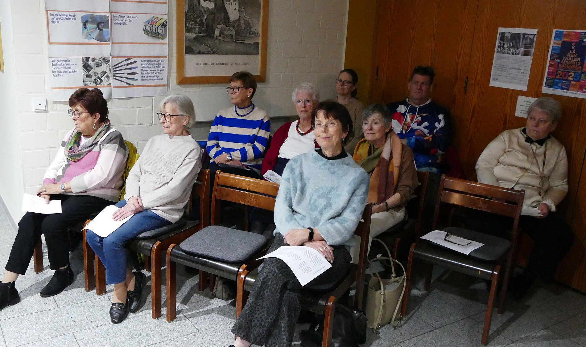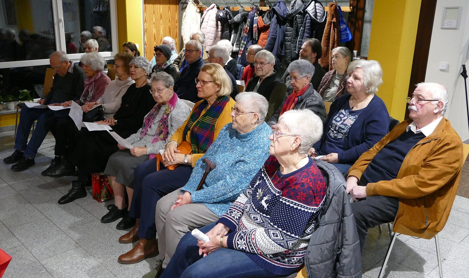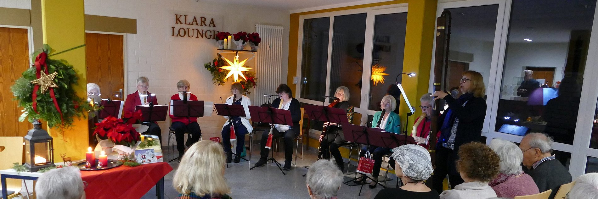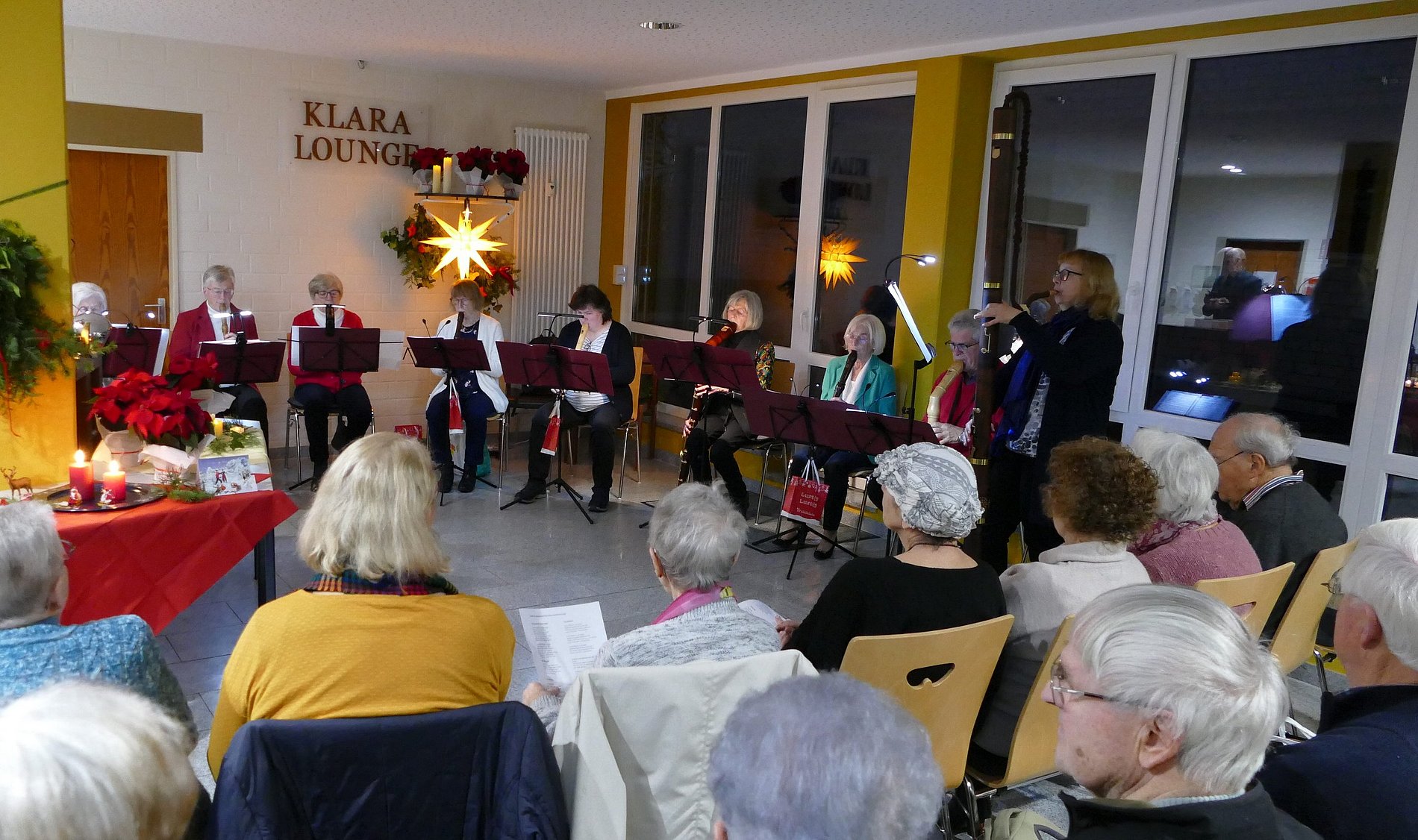 Und dann schlug die Stunde des Publikums, - es waren alle Plätze im adventlich geschmückten Foyer von St. Klara besetzt – denn es schloss sich das alljährlich geschätzte Weihnachtsliedersingen an. Liesel Burghard begleitete die eifrigen Sängerinnen und Sänger am Klavier. Es wurde so schön und laut gesungen, wie in keinem Gottesdienst in St. Klara in letzter Zeit mehr.