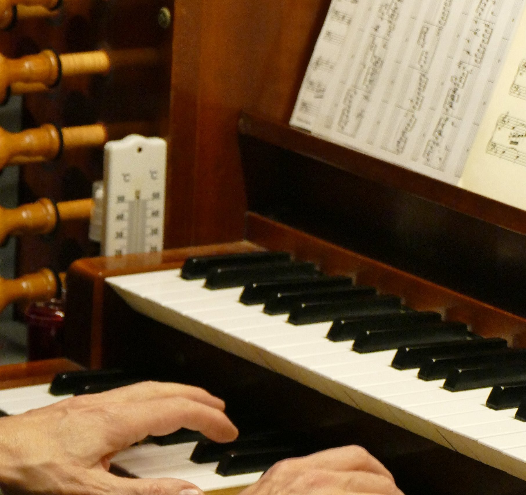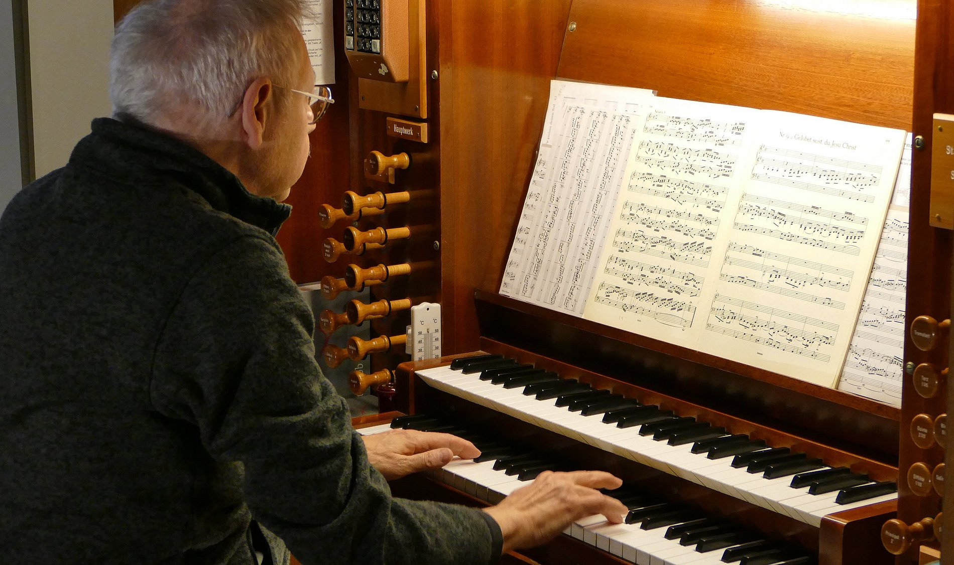 Burkhard Mohr hatte in den letzten Jahren die Orgel schon im Rahmen von Weihnachtskonzerten kennengelernt. Der studierte Kirchenmusiker und Komponist entlockte der Orgel Tonsequenzen, die im normalen Gottesdienst-Betrieb nicht so gebräuchlich sind. Herr Mohr intonierte Werke von Georg Böhm, Ute Kubeler, Johann Sebastion Bach und auch eigene Kompositionen.