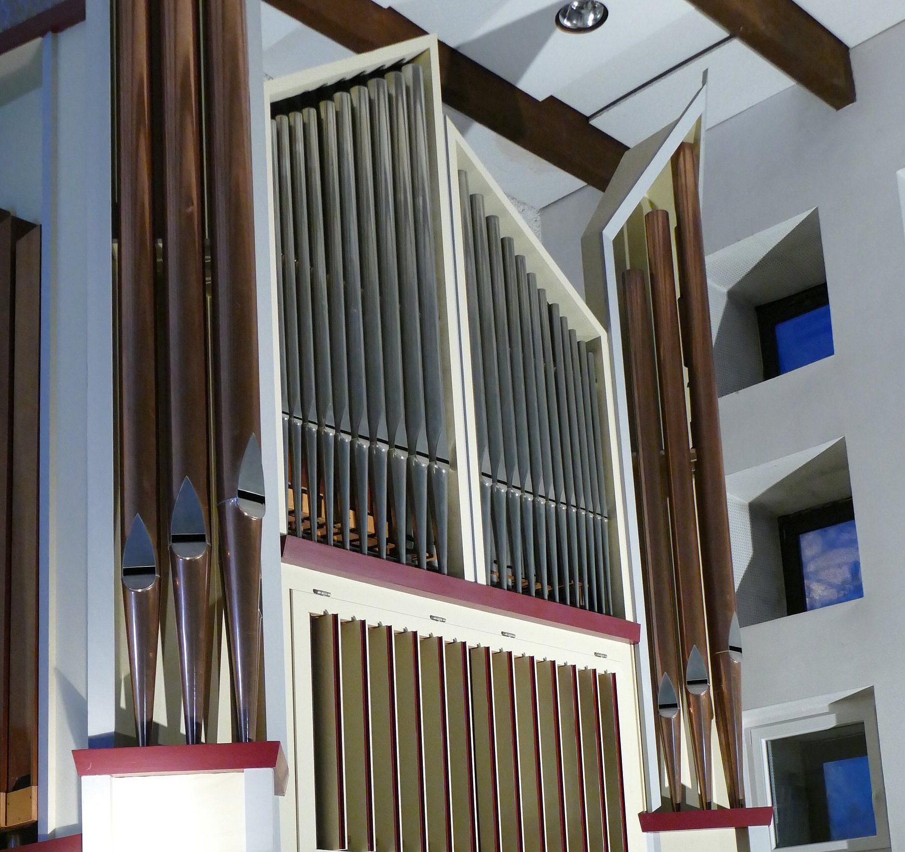 In seiner Begrüßung ging Dr. Rollig auch auf die Geschichte der Orgel ein. Nach dem Bau des Gemeindezentrums St. Klara reichte es 1975 finanziell nur zur Anschaffung eines gebrauchten Orgel-Positivs mit nur einem Manual. Das kleine Orgelchen leistete gute Dienste, war aber für den großen Kirchenraum nicht ganz raumfüllend. So beschloss die Gemeinde im Jahr 2001 die Anschaffung einer neuen größeren Orgel.