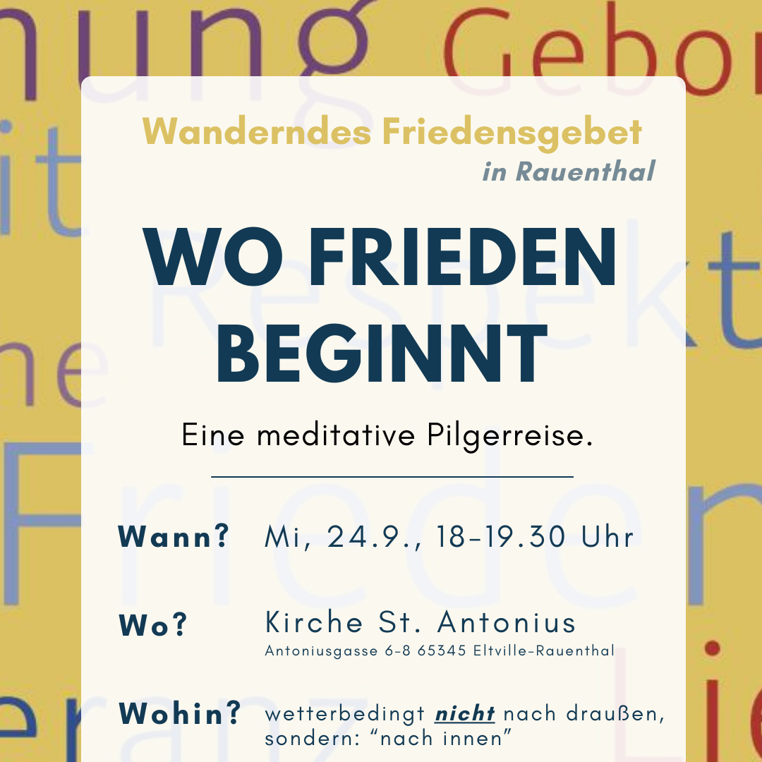 Am Freitag, 26. September, 18 Uhr, gestalten Theresa Kreuz und Ute Trimpert in unserer Pfarrkirche St. Peter und Paul in Schierstein das Friedensgebet: Herzliche Einladung an alle!