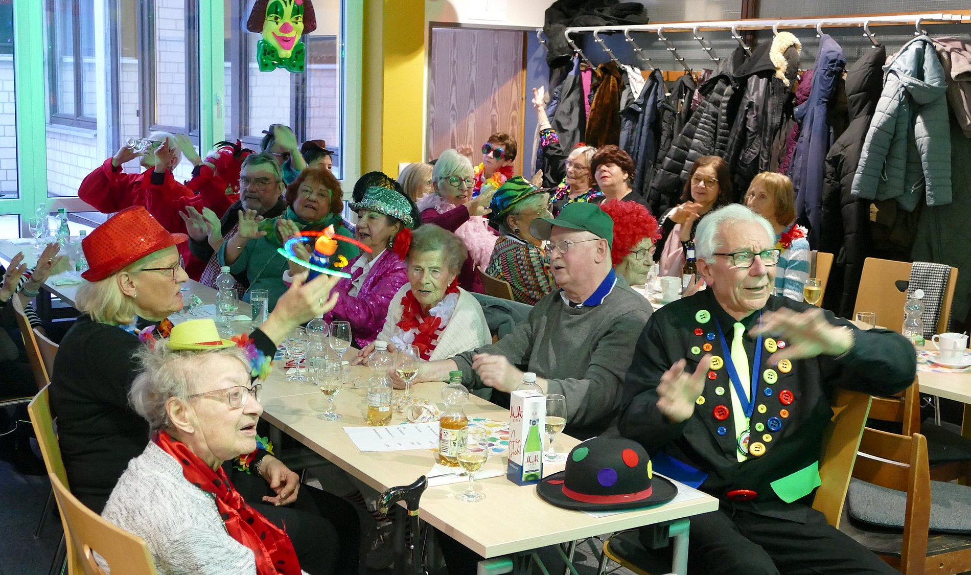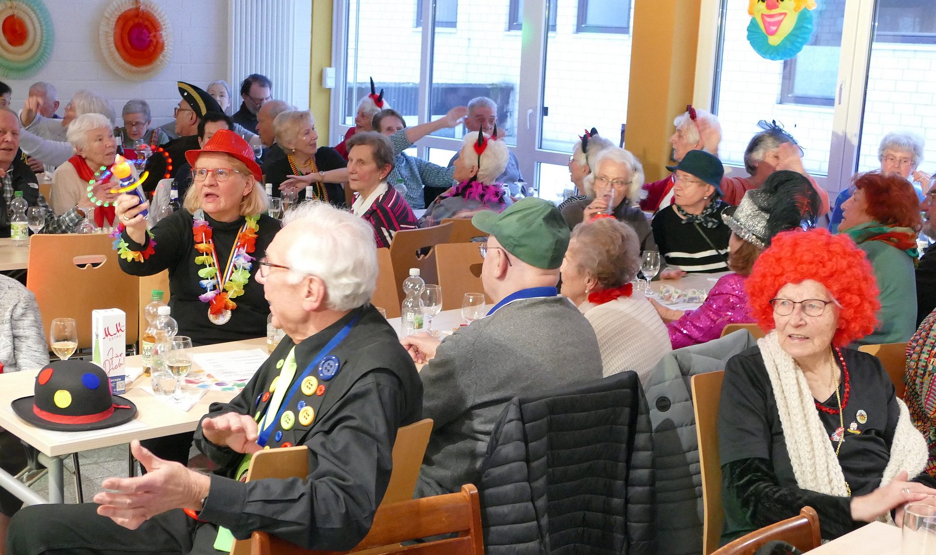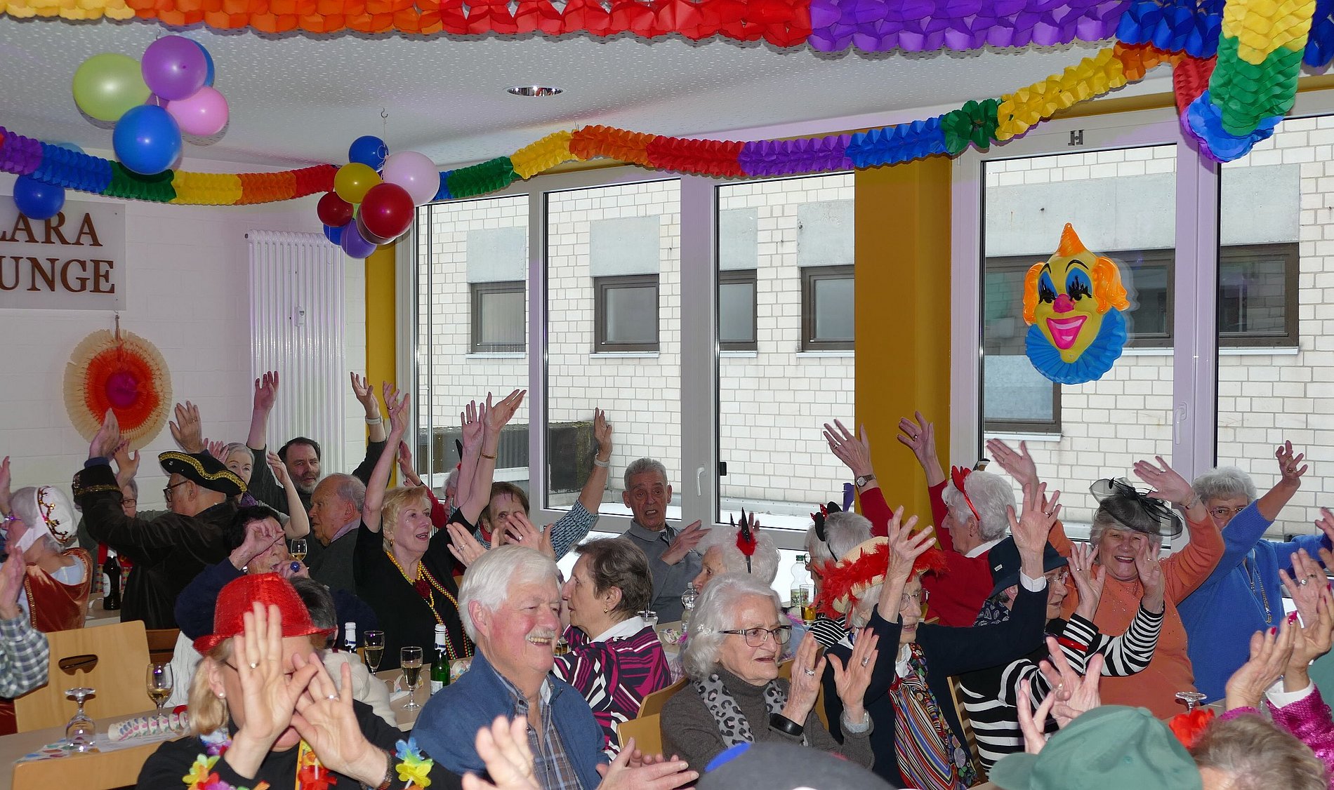 Glück hatte St. Klara mit dem Wetter. Wäre der Kreppelkaffee nur einen Tag früher terminiert gewesen, wäre er im Schneechaos untergegangen. So strömten am 4. Februar bei Sonnenschein und Temperaturen über Null ca. 60 Närrinnen und Narren, zum großen Teil fastnachtlich herausgeputzt, ins Gemeindezentrum St. Klara, dessen Foyer dann bis auf den allerletzten Platz gefüllt war.