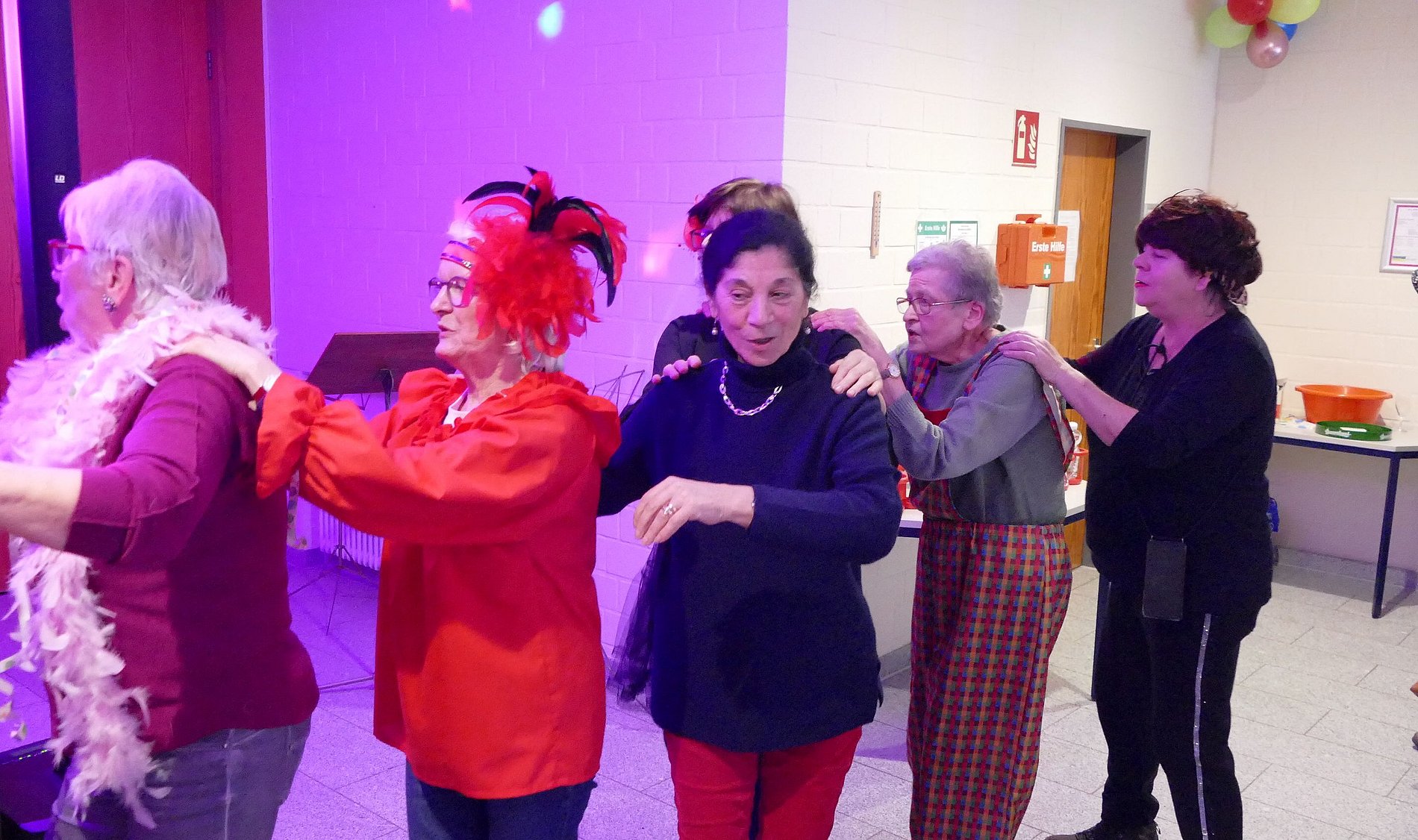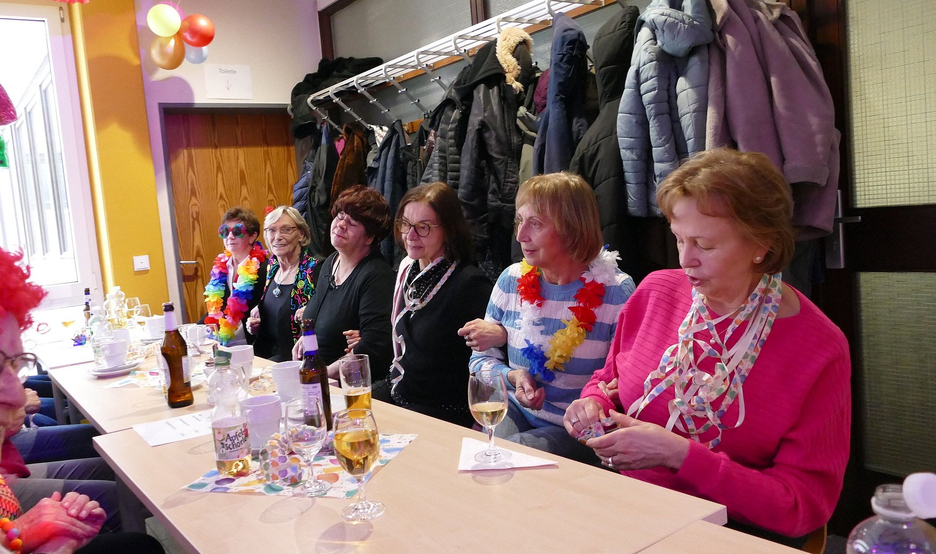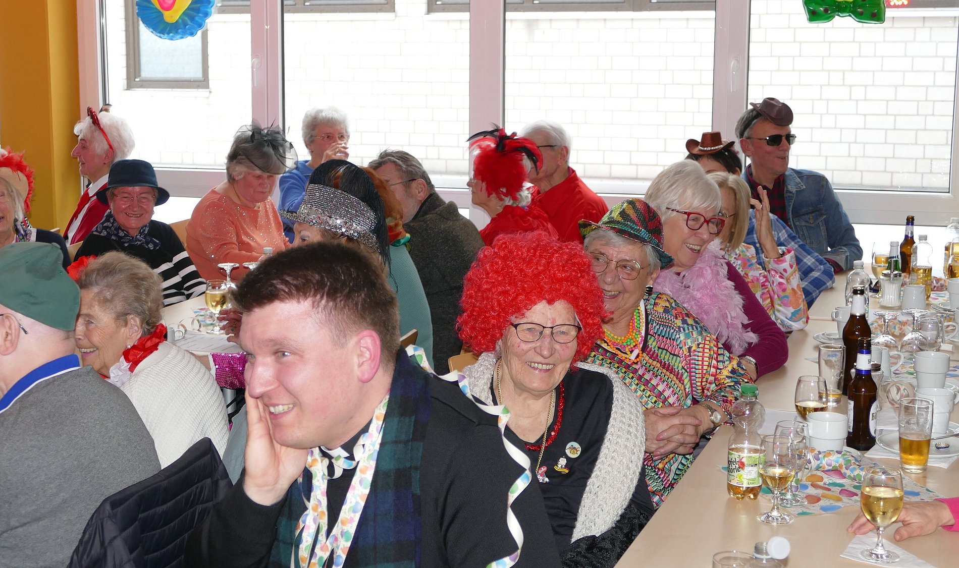 Nach einer Stärkung mit einem oder zwei Kreppel und reichlich Kaffee – serviert vom Senioren-Arbeitskreis – startete man pünktlich ins närrische Programm. Dieses wurde von den Aktiven der Gemeinde und zwei Gastrednern gekonnt bestritten. Iris Herz als „Sitzungspräsidentin“ konnte aus Schierstein Florian Nies als „Kurgast“, Christoph Fliegen als „gefrusteten Wachmann“, aus der Gemeinde Lissi Märtin als „Frauenhasserin“, das Ehepaar Rollig als Vater und Sohn bei „Mathe-Nachhilfe“, Werner Feix mit „dem Gegensatz von Alt und Jung“ und Peter Siersleben als „Neuinterpret der Schöpfungsgeschichte“ begrüßen. Und dann stieg sie zusammen mit Lissi Märten noch selbst als „tratschende Nachbarinnen“ in die Bütt. DJ Manuel Gall brachte, wie in den Vorjahren, die Stimmung der Gäste zum Kochen, animierte sie zum kräftigen Mitsingen und Schunkeln, ja sogar zu einer Polonaise und einer spontanen Tanzrunde.