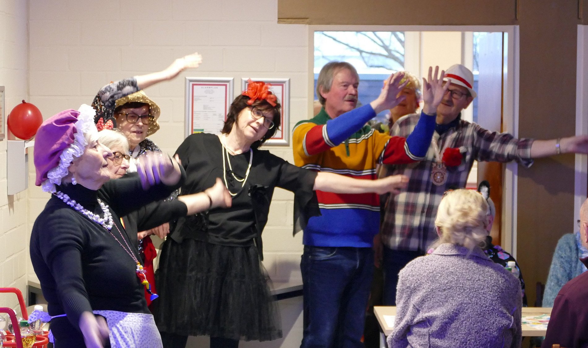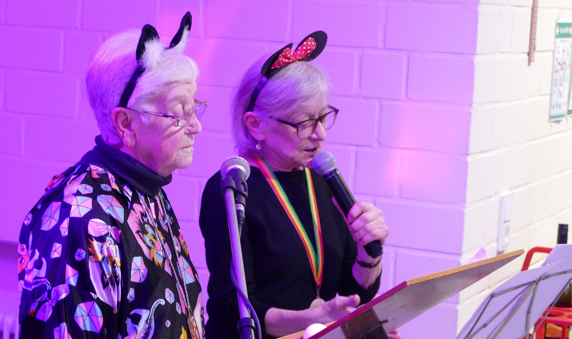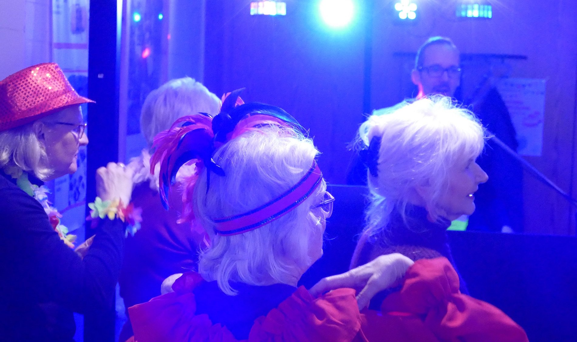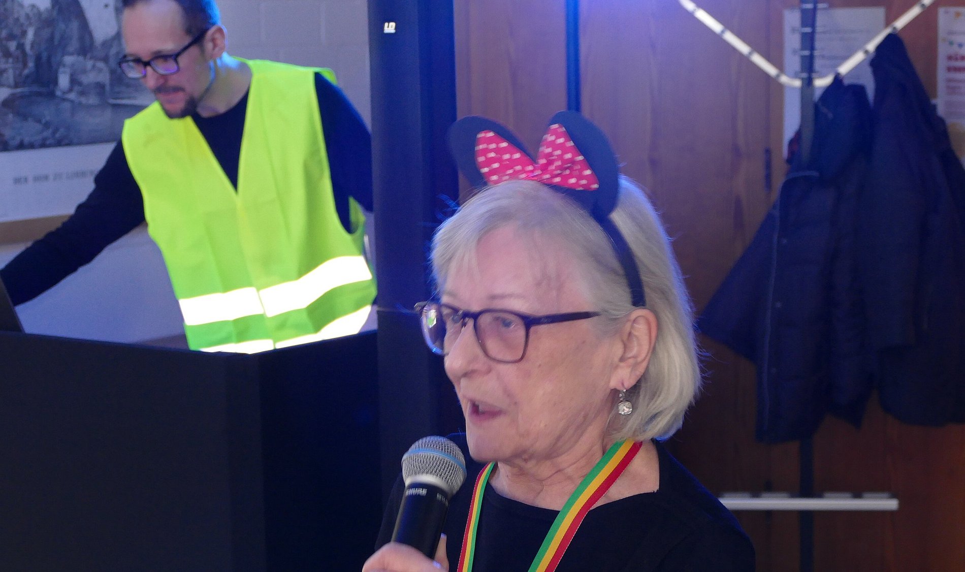 Nach einer Stärkung mit einem oder zwei Kreppel und reichlich Kaffee – serviert vom Senioren-Arbeitskreis – startete man pünktlich ins närrische Programm. Dieses wurde von den Aktiven der Gemeinde und zwei Gastrednern gekonnt bestritten. Iris Herz als „Sitzungspräsidentin“ konnte aus Schierstein Florian Nies als „Kurgast“, Christoph Fliegen als „gefrusteten Wachmann“, aus der Gemeinde Lissi Märtin als „Frauenhasserin“, das Ehepaar Rollig als Vater und Sohn bei „Mathe-Nachhilfe“, Werner Feix mit „dem Gegensatz von Alt und Jung“ und Peter Siersleben als „Neuinterpret der Schöpfungsgeschichte“ begrüßen. Und dann stieg sie zusammen mit Lissi Märten noch selbst als „tratschende Nachbarinnen“ in die Bütt. DJ Manuel Gall brachte, wie in den Vorjahren, die Stimmung der Gäste zum Kochen, animierte sie zum kräftigen Mitsingen und Schunkeln, ja sogar zu einer Polonaise und einer spontanen Tanzrunde.