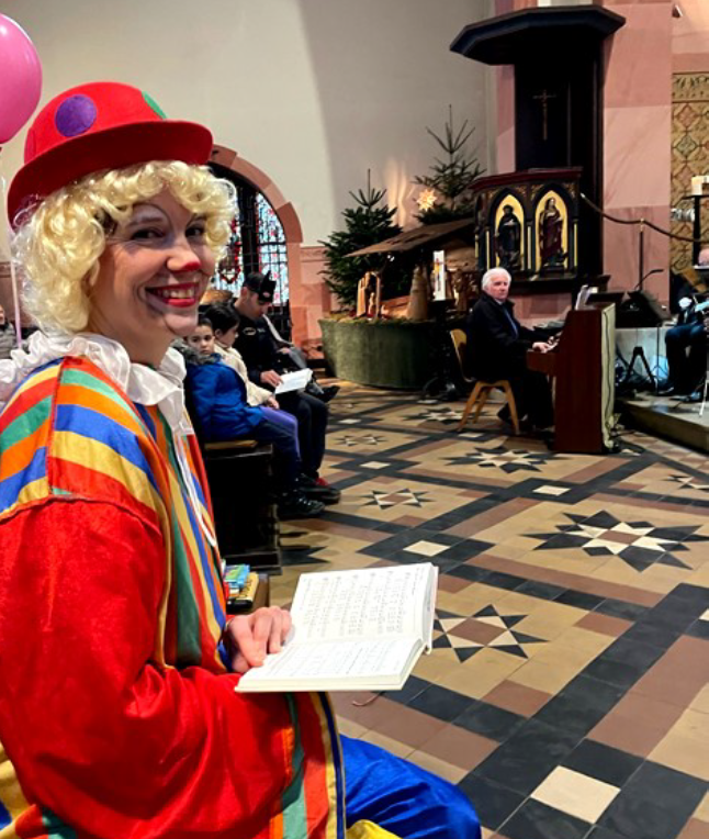 Die Gruppe Herzklang begleitete den Gottesdienst ganz wunderbar. Tolle Musik, zum Mitsingen, Tanzen und einfach fröhlich sein. Und Pater Joy mit Clownsnase sieht man auch nicht so oft. Und dann war da noch die Clownin Pauline (Theresa Kreutz), die sich in die Sonntagsmesse verirrt und mir und den Kindern viele lustige Fragen gestellt hat. Mit unserem Gespräch hat sie es für die Kindern auf den Punkt gebracht: Wir alle sind Helden, nicht immer Superhelden, wie im Film, sondern viel besser, mit der (Super)-kraft des Heiligen Geistes, Helden der Liebe, wie Jesus einer war! Allen ein herzliches Dankeschön! Und natürlich HELAU.