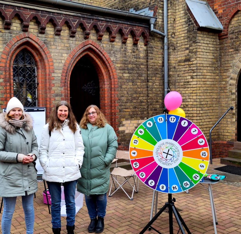 Vergangene Woche waren Mitglieder des Pastoralteams mit dem Glücksrad an der Kita Herz Jesu. Die Kinder konnten kleine Preise wie Kreide, Stifte, Seifenblasen oder Süßigkeiten gewinnen, während Mütter und Väter an einer Befragung teilnahmen: Was könnte auf dem Kirchengelände entstehen? In welchen Lebensphasen brauchen Familien derzeit besondere Unterstützung? Über welche Angebote würden sich Kinder und Eltern im Alfred-Delp-Haus freuen?