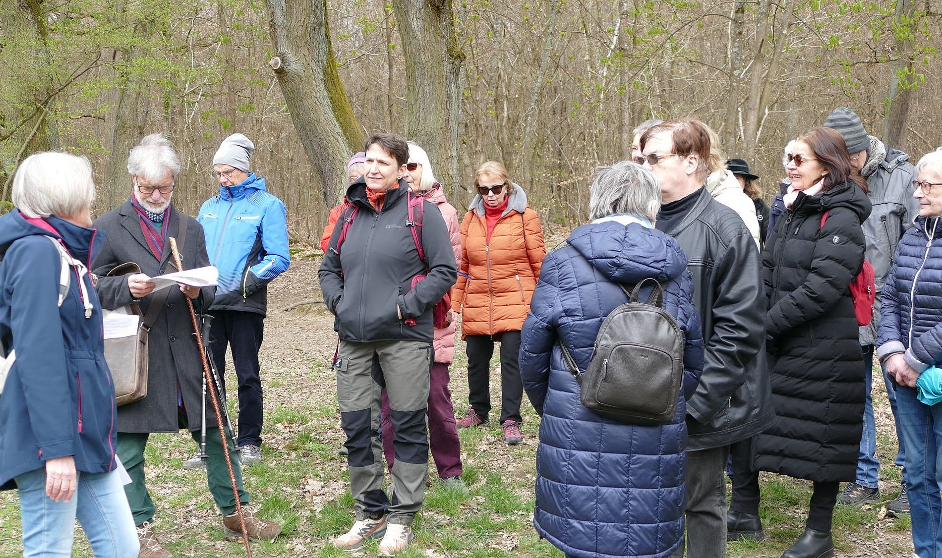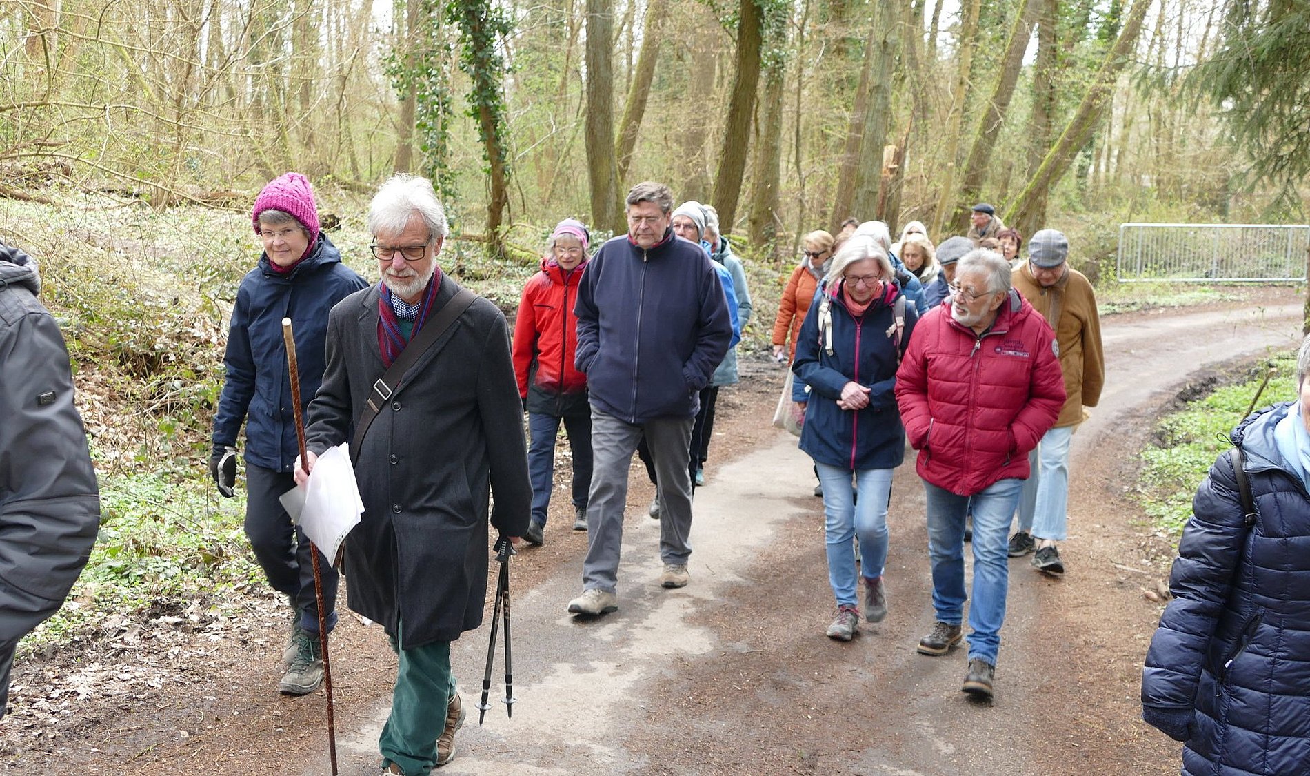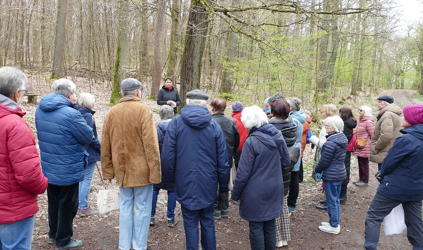 Ganz anders in den letzten Jahren, so auch in 2026. Am Palmsonntag um 14 Uhr trafen sich 26 Christinnen und Christen vor der Kapelle in Alt-Klarenthal. Sie folgten dem Vorbereitungsteam mit Pastoralreferentin Anke Jarzina, Daniela Blass und Pfarrer Alexander Liermann, die unter dem Leitgedanken „Hindernisse und Himmelsblicke“ den Weg in den Wiesbadener Stadtwald wiesen. An der ersten Wegkreuzung wurde innegehalten. Eine Kreuzung ist für jeden Wanderer ein Ort der Entscheidung, ob er abbiegt oder geradeaus weiterläuft. So ist es auch vielfach im Leben. Andauernd kommen Wegkreuzungen und Entscheidungspunkte auf einem zu. Das gemeinsam gesungene Lied „Wechselnde Pfade, Schatten und Licht, alles ist Gnade, fürchte dich nicht“ leitete zur nächsten Station über. Der Weg öffnete sich auf der einen Seite zu einer Waldwiese. Daniela Blass wies darauf hin, dass die Wiese eine große Weite eröffnet. Wenn man sie betritt, stehe man im Hellen und wird von allen gesehen. Bleibt man am Rand, bleibt man unsichtbar, hat aber einen guten Überblick. Sie erzählte aus ihrem Leben – von einer Situation, in der es ihr abverlangt wurde zu entscheiden, ob sie in die Weite treten sollte. Sie hat es getan und es war gut so.
