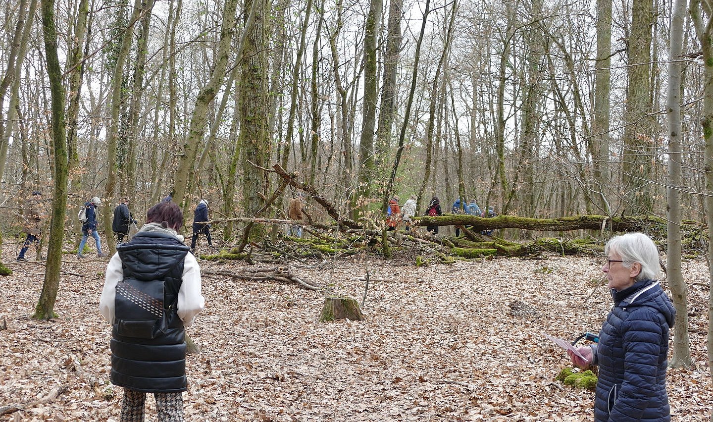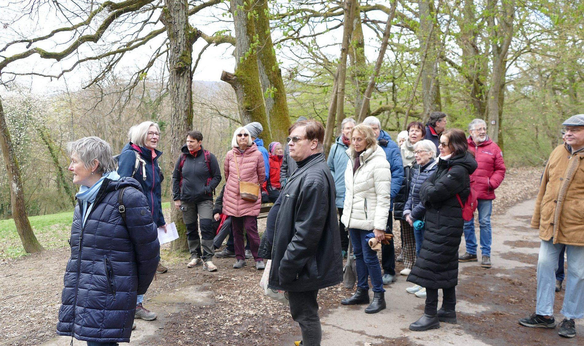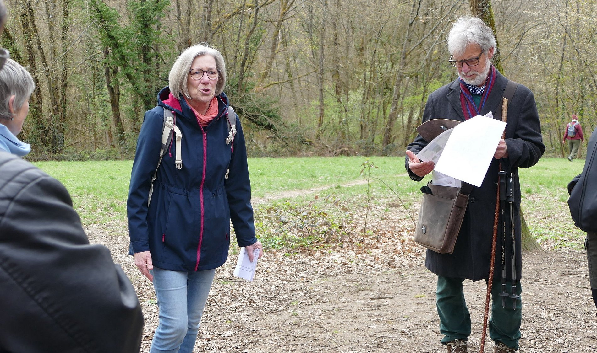 Ganz anders in den letzten Jahren, so auch in 2026. Am Palmsonntag um 14 Uhr trafen sich 26 Christinnen und Christen vor der Kapelle in Alt-Klarenthal. Sie folgten dem Vorbereitungsteam mit Pastoralreferentin Anke Jarzina, Daniela Blass und Pfarrer Alexander Liermann, die unter dem Leitgedanken „Hindernisse und Himmelsblicke“ den Weg in den Wiesbadener Stadtwald wiesen. An der ersten Wegkreuzung wurde innegehalten. Eine Kreuzung ist für jeden Wanderer ein Ort der Entscheidung, ob er abbiegt oder geradeaus weiterläuft. So ist es auch vielfach im Leben. Andauernd kommen Wegkreuzungen und Entscheidungspunkte auf einem zu. Das gemeinsam gesungene Lied „Wechselnde Pfade, Schatten und Licht, alles ist Gnade, fürchte dich nicht“ leitete zur nächsten Station über. Der Weg öffnete sich auf der einen Seite zu einer Waldwiese. Daniela Blass wies darauf hin, dass die Wiese eine große Weite eröffnet. Wenn man sie betritt, stehe man im Hellen und wird von allen gesehen. Bleibt man am Rand, bleibt man unsichtbar, hat aber einen guten Überblick. Sie erzählte aus ihrem Leben – von einer Situation, in der es ihr abverlangt wurde zu entscheiden, ob sie in die Weite treten sollte. Sie hat es getan und es war gut so.