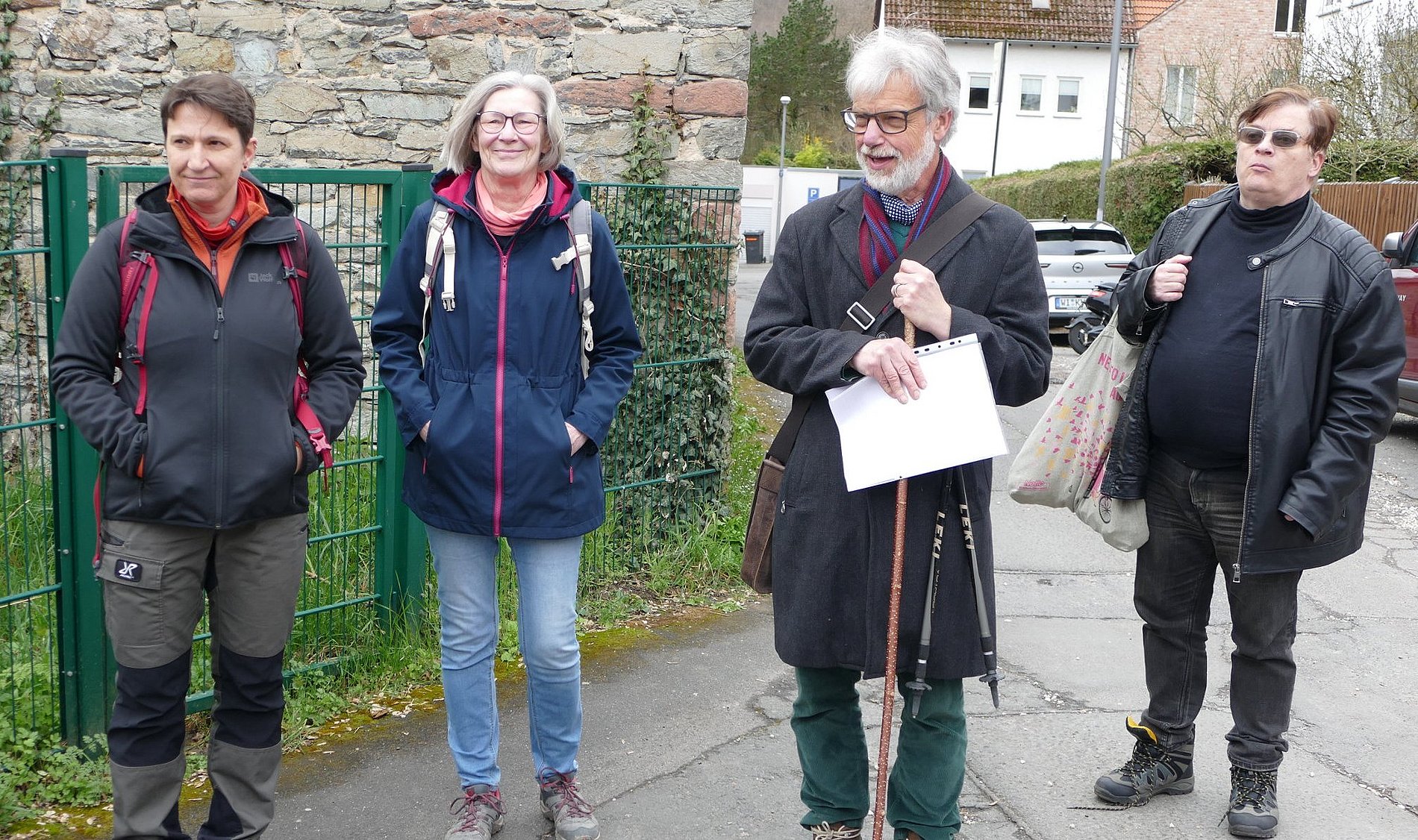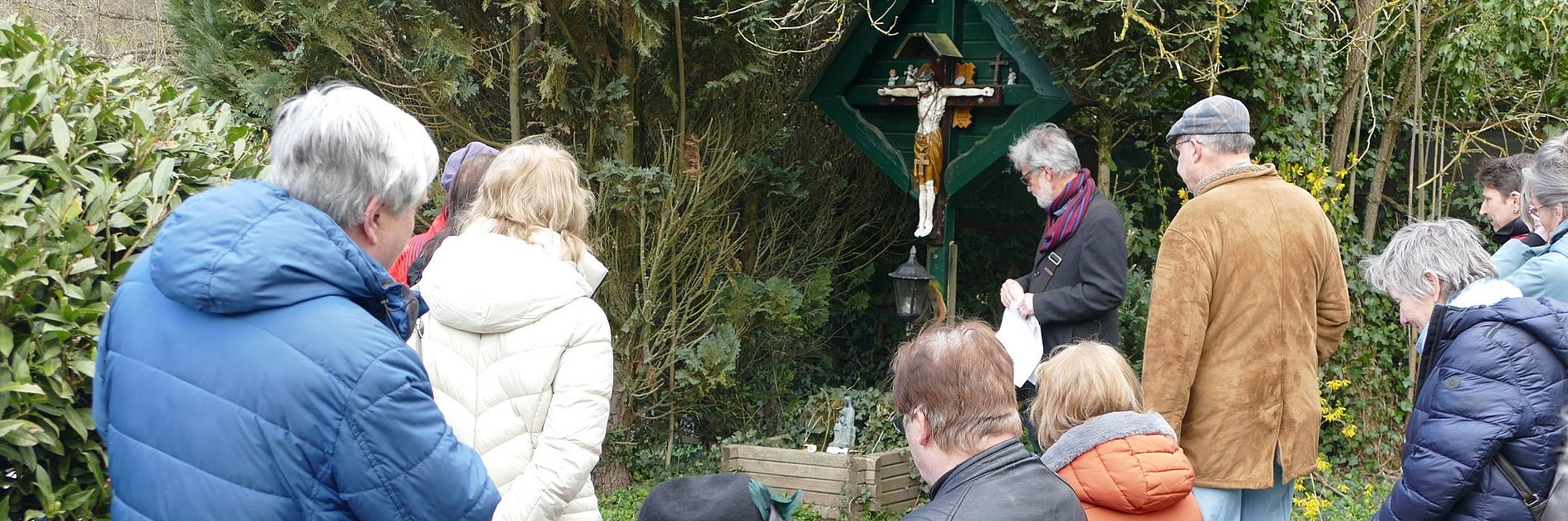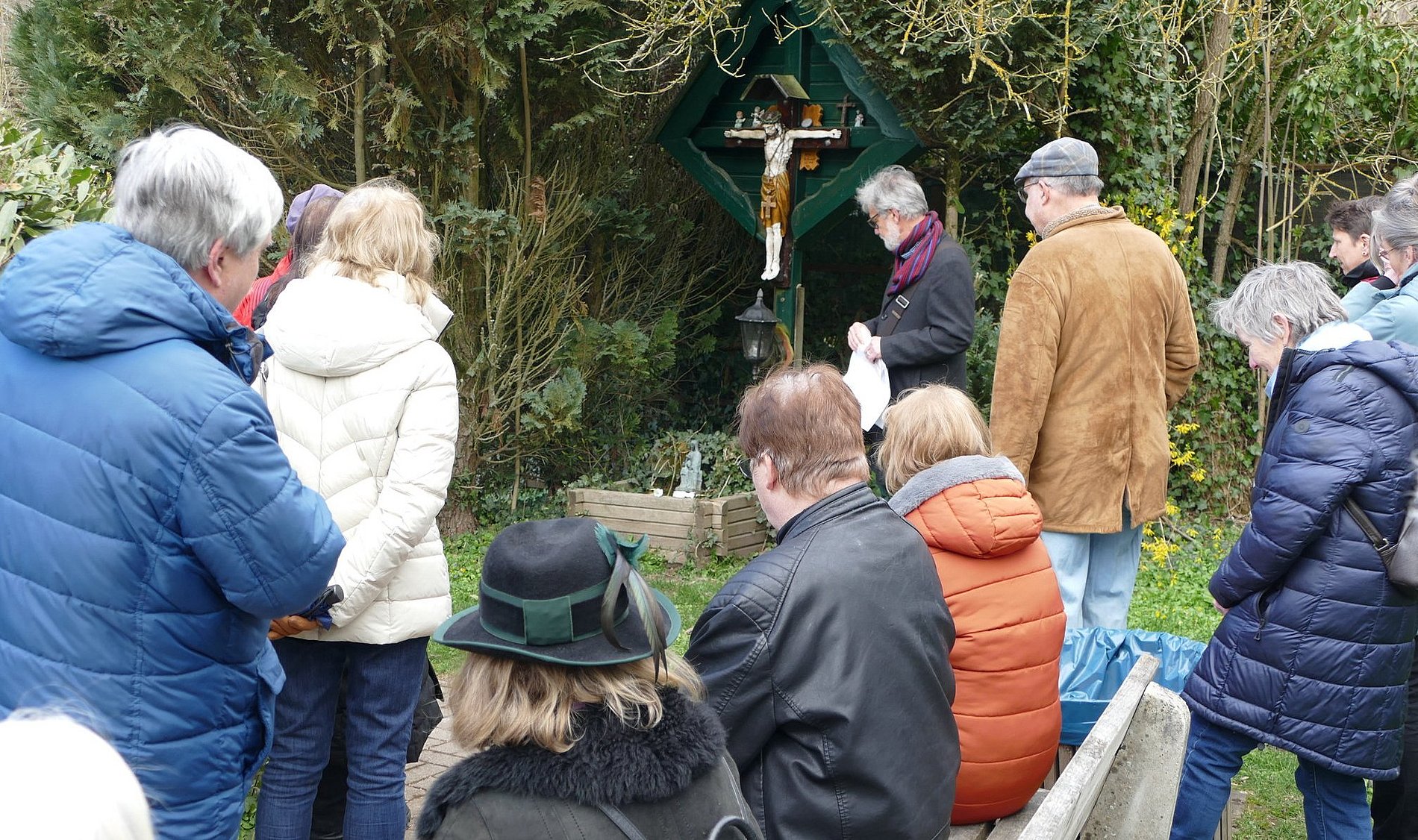 Auf dem Rückweg hielt die Pilgergruppe noch auf dem ehemaligen Friedhof von Alt-Klarenthal inne. Hier steht ein mannshohes Kruzifix. Pfarrer Liermann nahm dieses Kreuz als Aufhänger für seine Gedanken zur Passion. Mit dem bekannten Lied „Meine engen Grenzen“ und dem Segen endete der diesjährige meditative Spaziergang. Das Wetter war den Pilgern hold, kein Regen, dafür ab und zu ein paar Sonnenstrahlen.