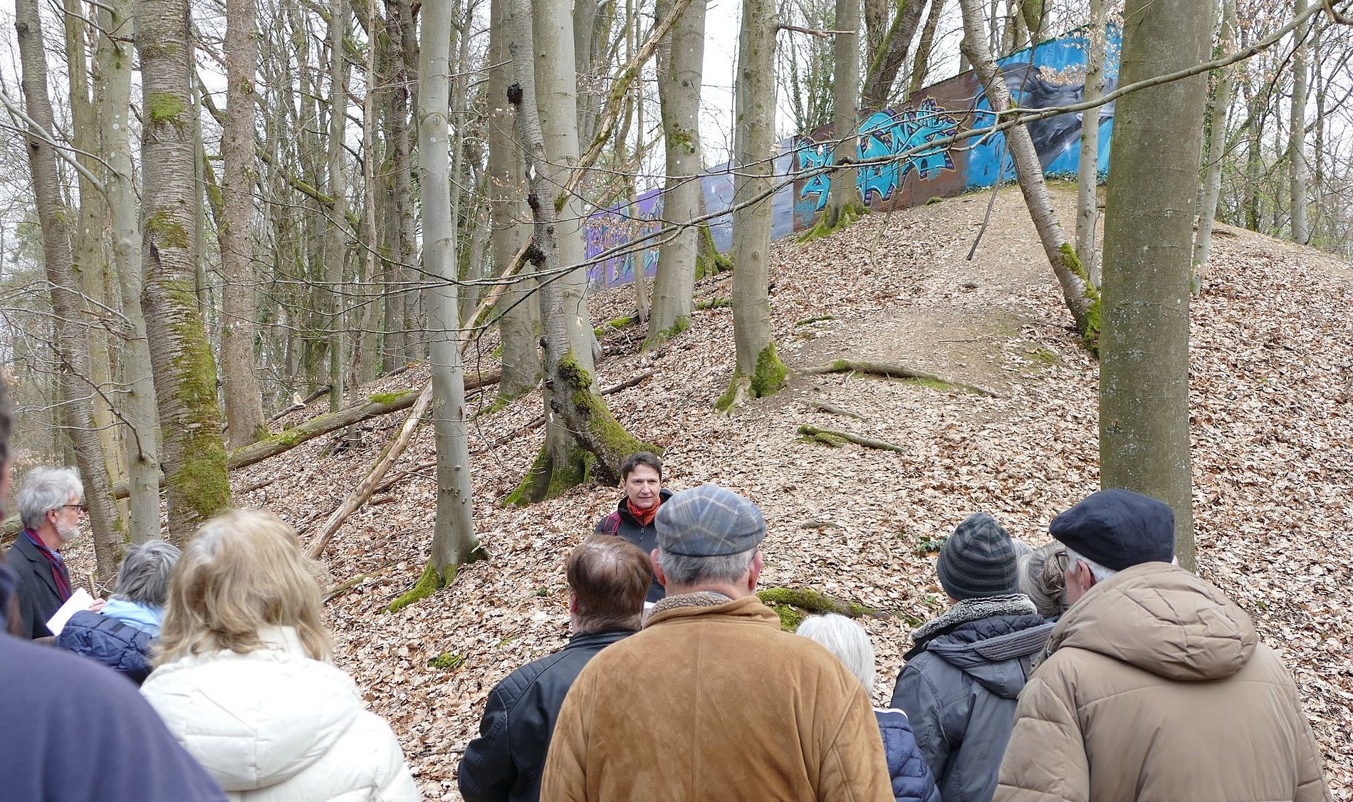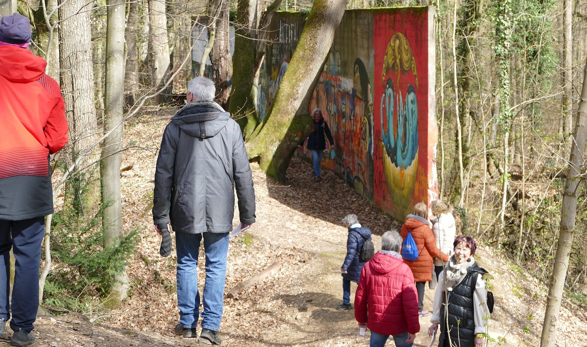 Weiter ging der Pilgerpfad über unebenes Gelände hin zu von bunten Mauerstücken bekrönten steilen Erhebungen, Reste einer ehemaligen Militärschießbahn aus Vorzeiten, einem „Lost Place“. Pfarrer Liermann und Anke Jarzina sprachen über Mauern, die plötzlich im Leben vor einem auftauchen, von der Sicht von beiden Seiten der Mauer. Auch von Jesus, der im Garten Gethsemane plötzlich in der dräuend vor ihm stehenden Passion eine Mauer vor sich sah, die er zu gern umgangen hätte. Ein Fragenkatalog regte die Pilger zur Eigenreflexion zur Frage nach den Mauern im eigenen Leben an.